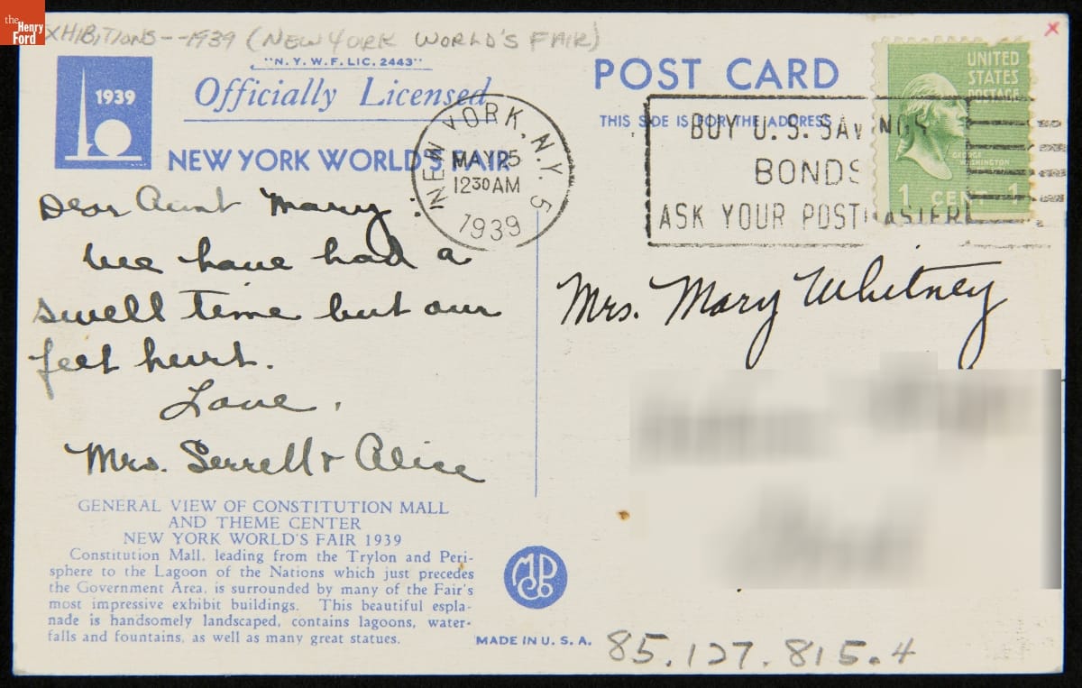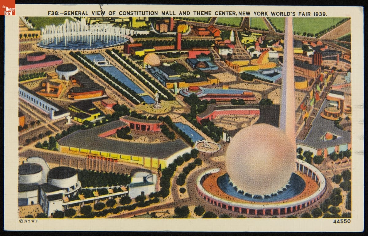 Postcards from the 1939 New York World's Fair depicted colorful images of exposition buildings or other scenes. Tourists purchased these and mailed them back to family and friends. This scene shows a general view of the main area of the fair, with all roads leading to the fair's iconic symbols, the Trylon and Perisphere.