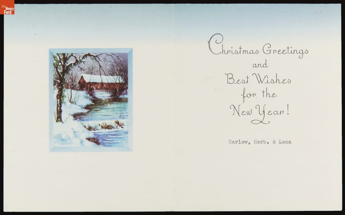 Mailing colorful, commercially designed greeting cards had become an American tradition by the 1920s and 1930s. Friends and neighbors commonly exchanged cards that wished one another a merry Christmas or happy New Year during the winter holidays. Publishers sometimes decorated these cards with nostalgic images of mills, churches, or covered bridges steeped in snow.