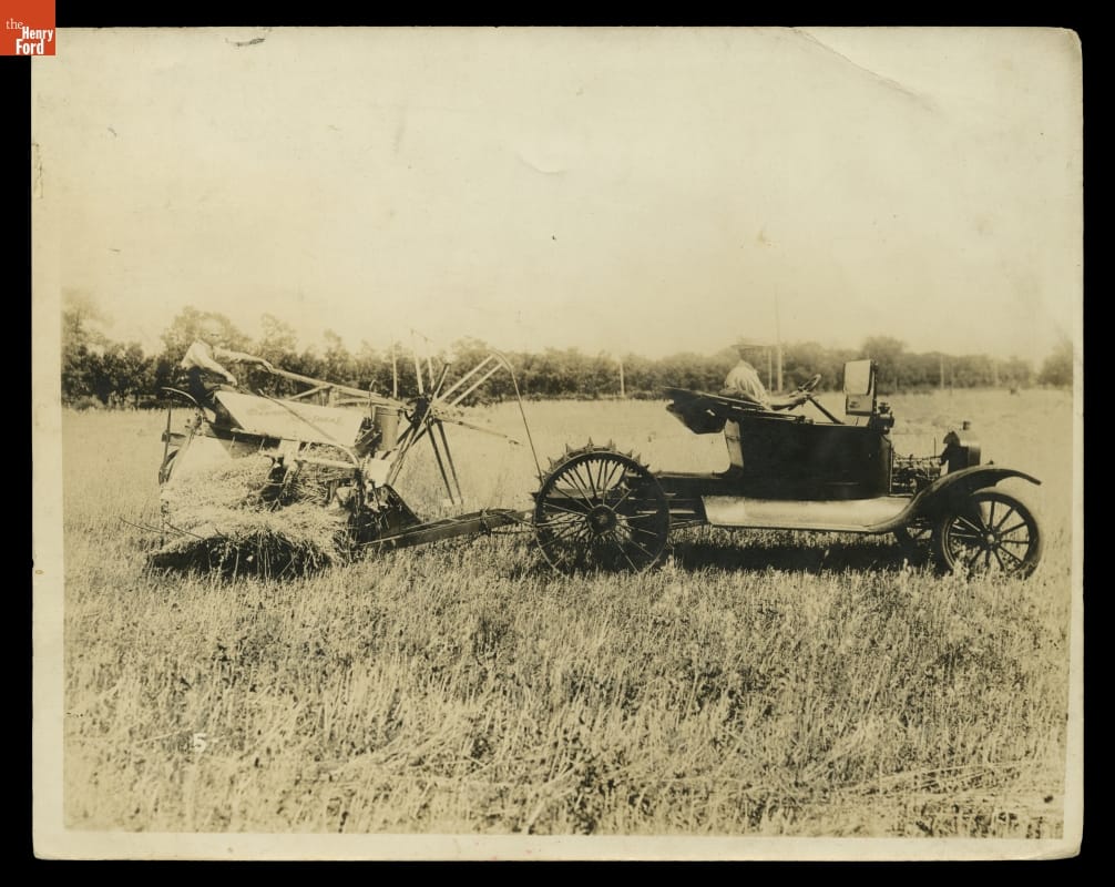 Ford Model T Runabout Converted to a Tractor, Reaping Grain, circa 1919