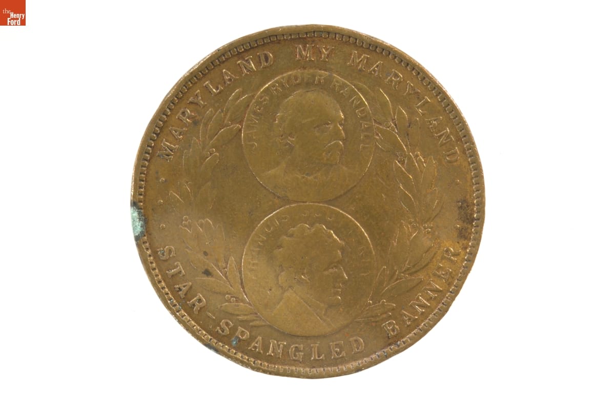 All forty-eight states participated in the 1915 Panama-Pacific International Exposition in San Francisco, California. Several states issued commemorative medals to help raise exhibition funds. Maryland's coin depicts two of its favorite sons -- James Ryder Randall, author of the Maryland state anthem, and Francis Scott Key, author of the Star Spangled Banner. State officials distributed these medals on Maryland Day at the fair.