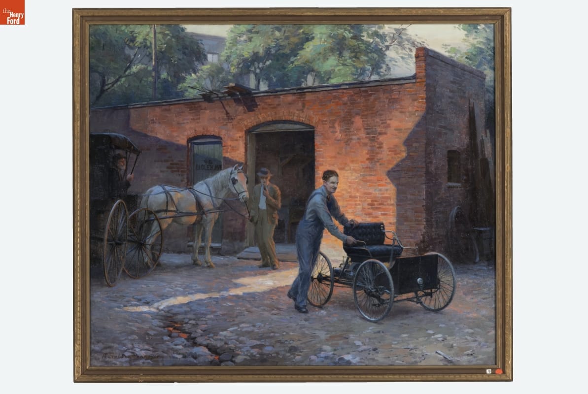 Artist Albert Pennoyer showed Henry Ford pushing his Quadricycle from the shed behind his house on Detroit's Bagley Avenue. Pennoyer emphasized the little car's novelty by including a horse and buggy -- and two skeptical onlookers -- in the scene. Ford and friends built the gasoline-powered Quadricycle in that shed, and Ford first drove it on June 4, 1896.
