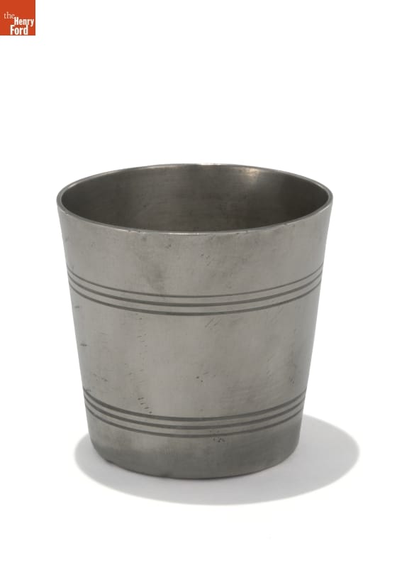 Beakers are tapered drinking vessels without a handle that often have a flared mouth or base. Pewter examples from the late 18th and 19th centuries could be found in the homes of Americans of modest means. They were also used in taverns and inns or in churches where they served as communion cups.