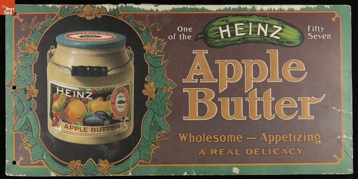 Henry J. Heinz rarely missed an opportunity to market his "57 Varieties" -- a catchy slogan he created despite offering a line of more than 60 packaged food products. A prolific promoter, Heinz aimed to reach consumers in stores, at home, and everywhere in-between. This colorful poster advertised Heinz Apple Butter to passengers riding in a streetcar.