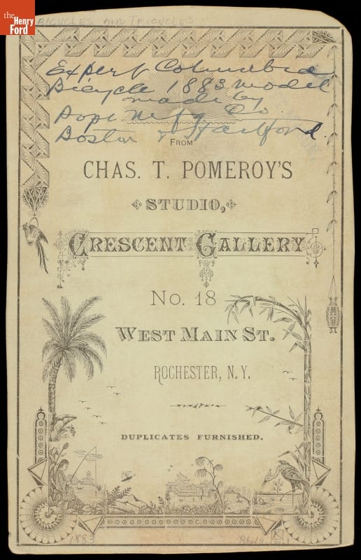 Photographer's imprint on back: FROM / CHAS. T. POMEROY'S / STUDIO, / CRESCENT GALLERY / NO. 18 / WEST MAIN ST. / ROCHESTER, N.Y. / DUPLICATES FURNISHED. Handwritten on back: Expert Columbia / Bicycle 1883 model / made by / Pope Mfg. Co. / Boston & Hartford