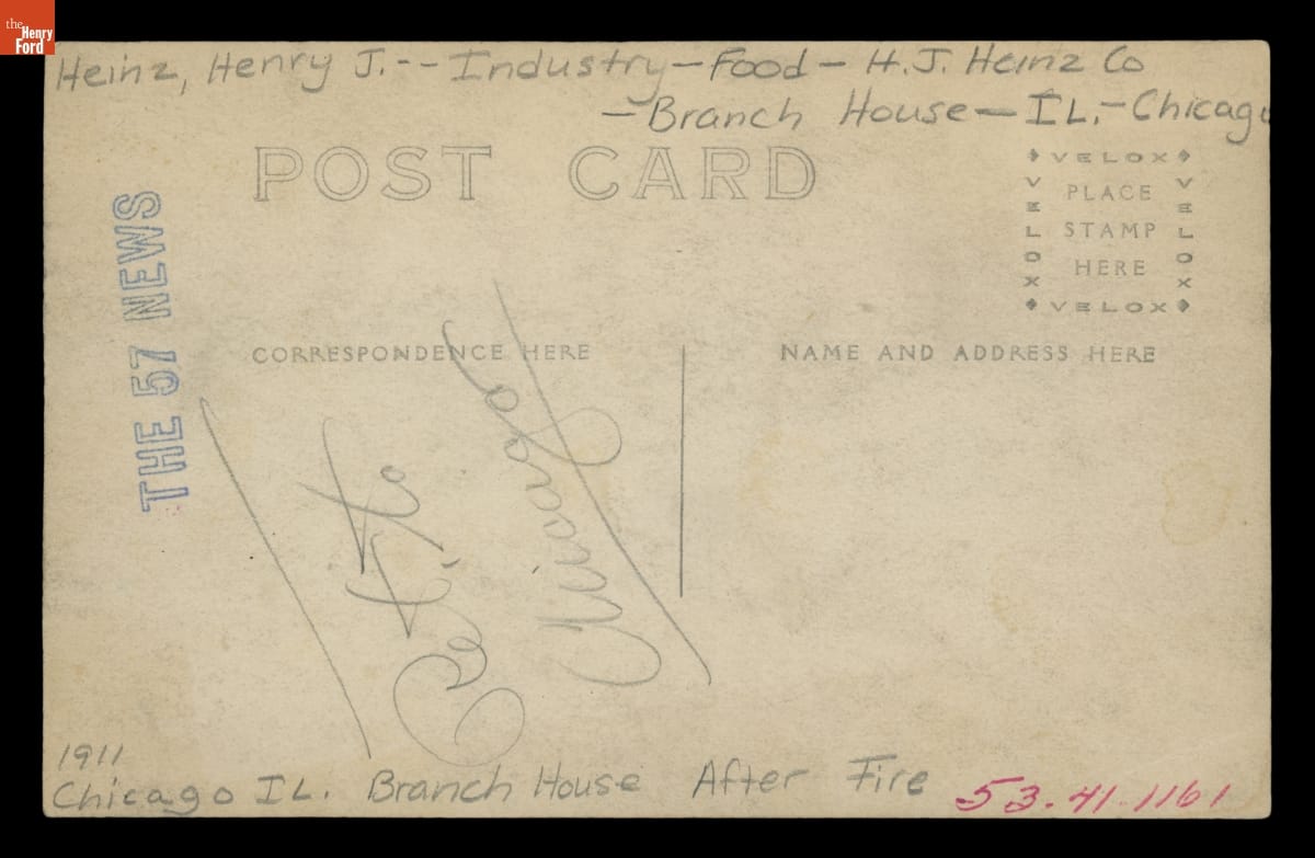 This photograph shows the scene of a destructive fire at a H.J. Heinz Company branch house in Chicago, Illinois, in 1911. Fire was a constant threat to factories and industrial facilities. Firefighters focused their efforts on saving lives, controlling the fire, and preventing damage to nearby buildings.