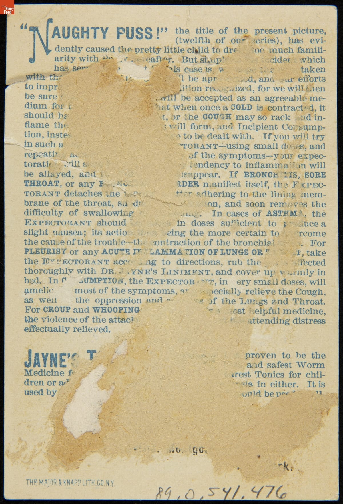 Trade Card for Dr. Jayne's Patent Medicines, "Naughty Puss!," 1880-1900