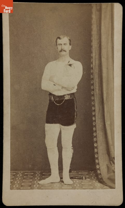 This man, identified as Thomas Shaw, was a fireman with the Alert Hose Company of Big Rapids, Michigan. To 21st-century eyes his uniform may appear odd, but it was worn during firemen's tournaments and not for fighting fires. These competitions pitted rival firefighting companies against each other in engine and hose races and other tests of firefighting skills needed during fire emergencies.