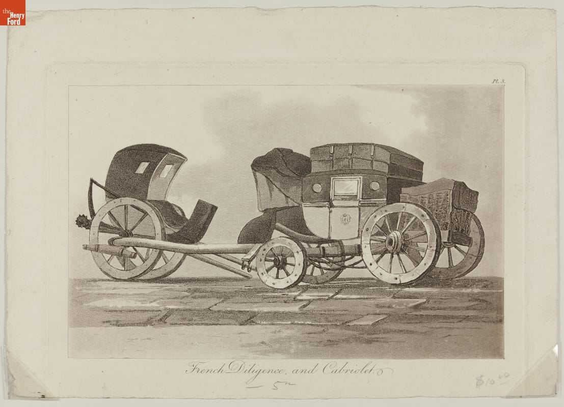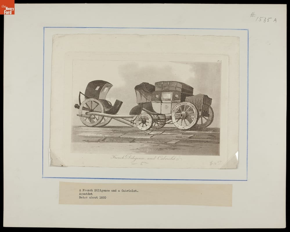 This circa 1830 aquatint depicts both a French diligence and a cabriolet. A cabriolet, seen on the left, was a light carriage with a collapsible top or roof, while a diligence was a public conveyance that was essentially a cabriolet attached to a coach, typically pulled by four horses.
