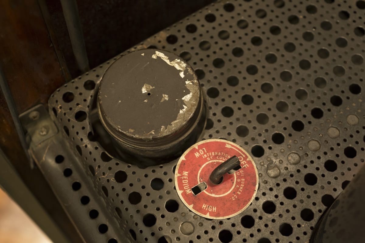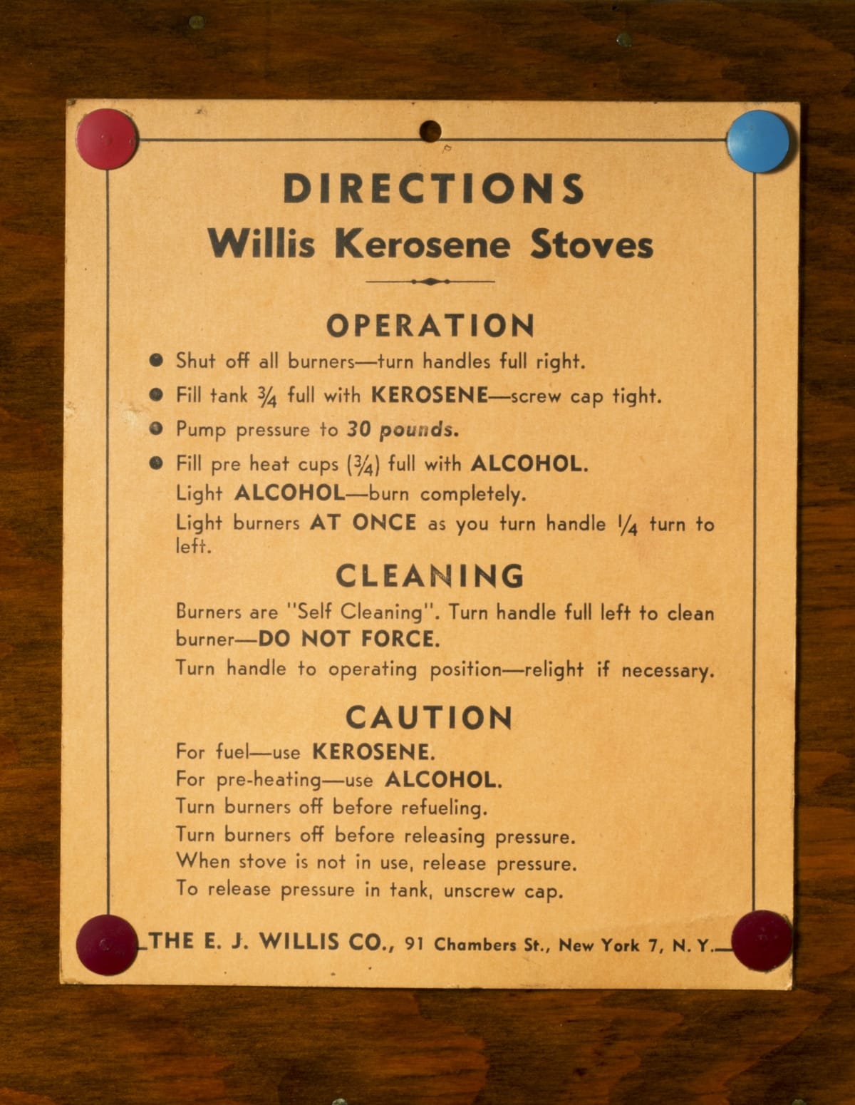 Paper tacked on interior upper left cabinet above stove: (handwritten) COOKING STOVE & HEATER / BOTH RUN ON KERSOSENE. / PRIME COOKING STOVE WITH ALCOHOL.