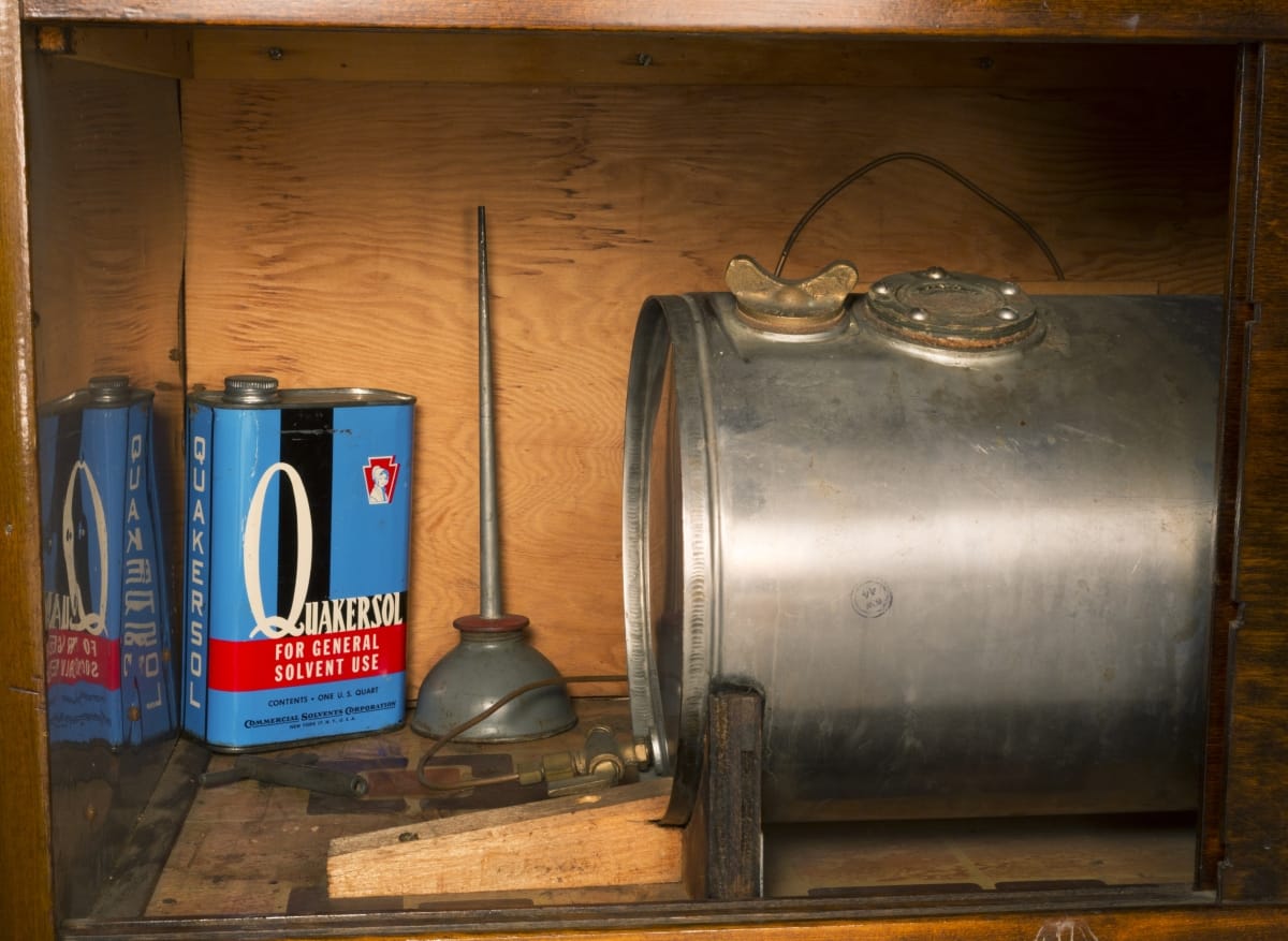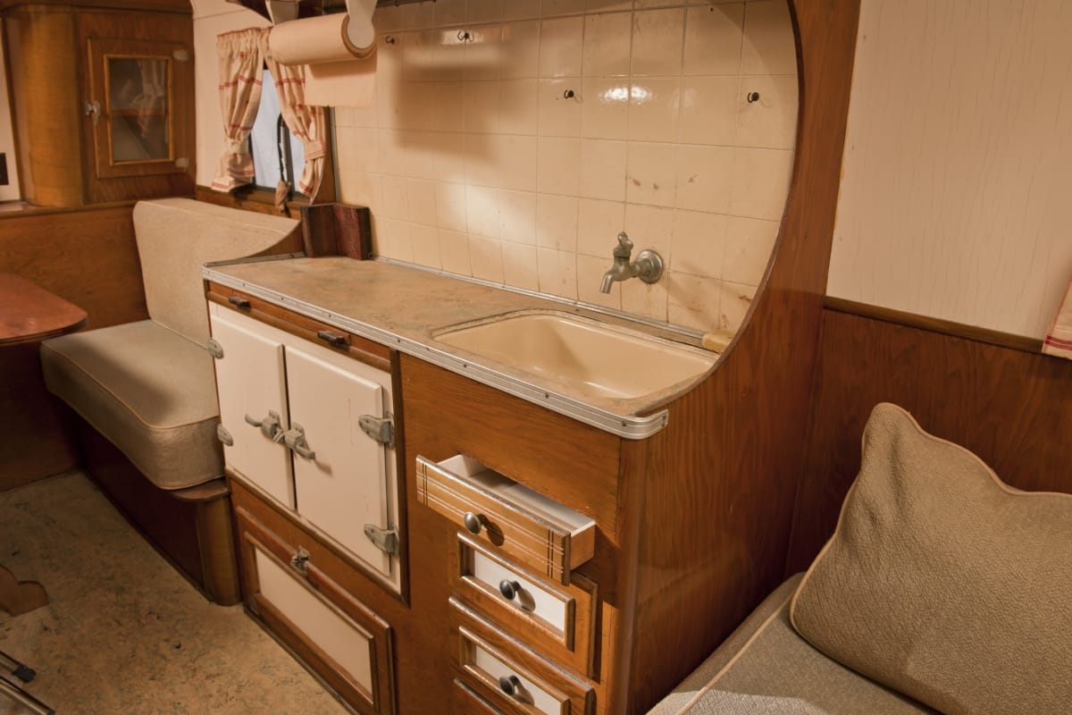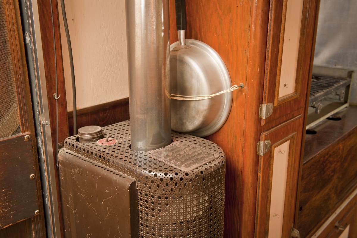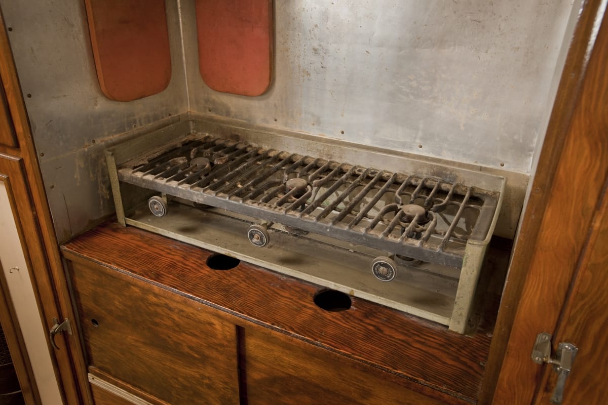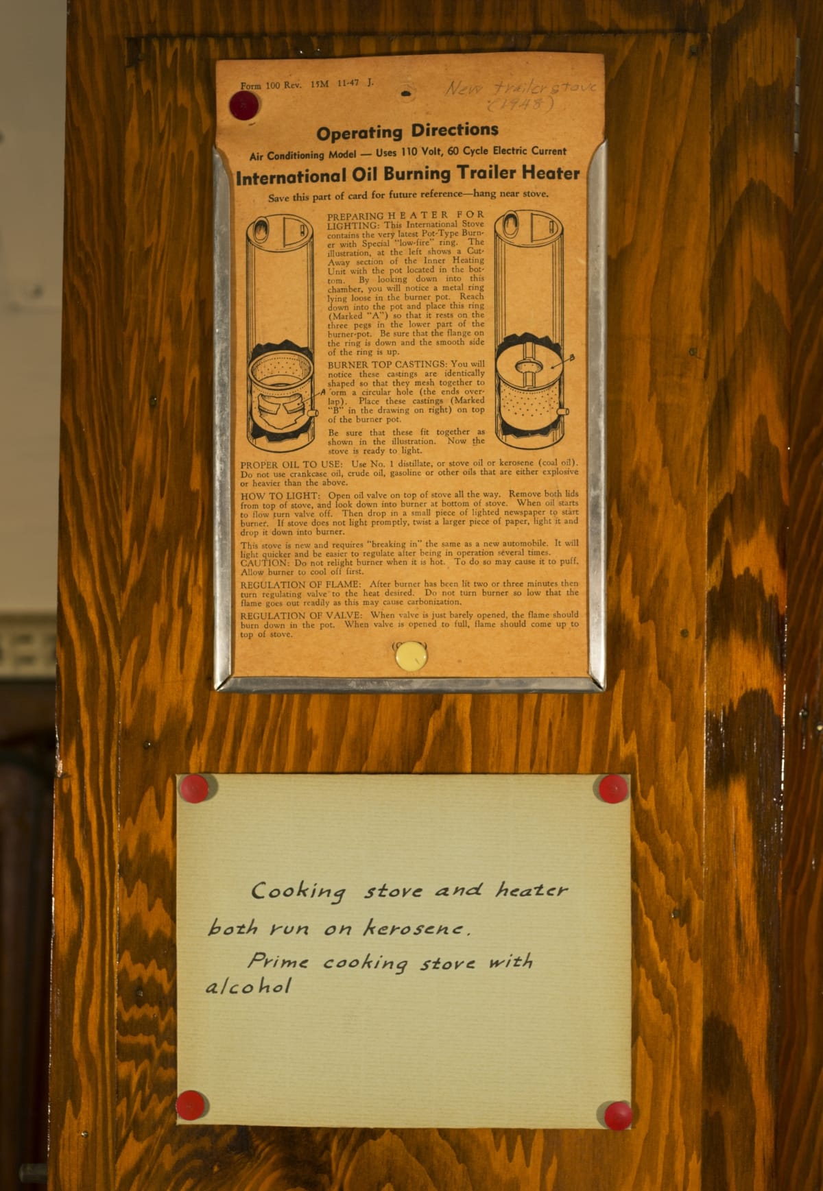Paper tacked on interior upper left cabinet above stove: (in pencil) NEW TRAILER STOVE / (1948) / (printed) OPERATING DIRECTIONS [...]
