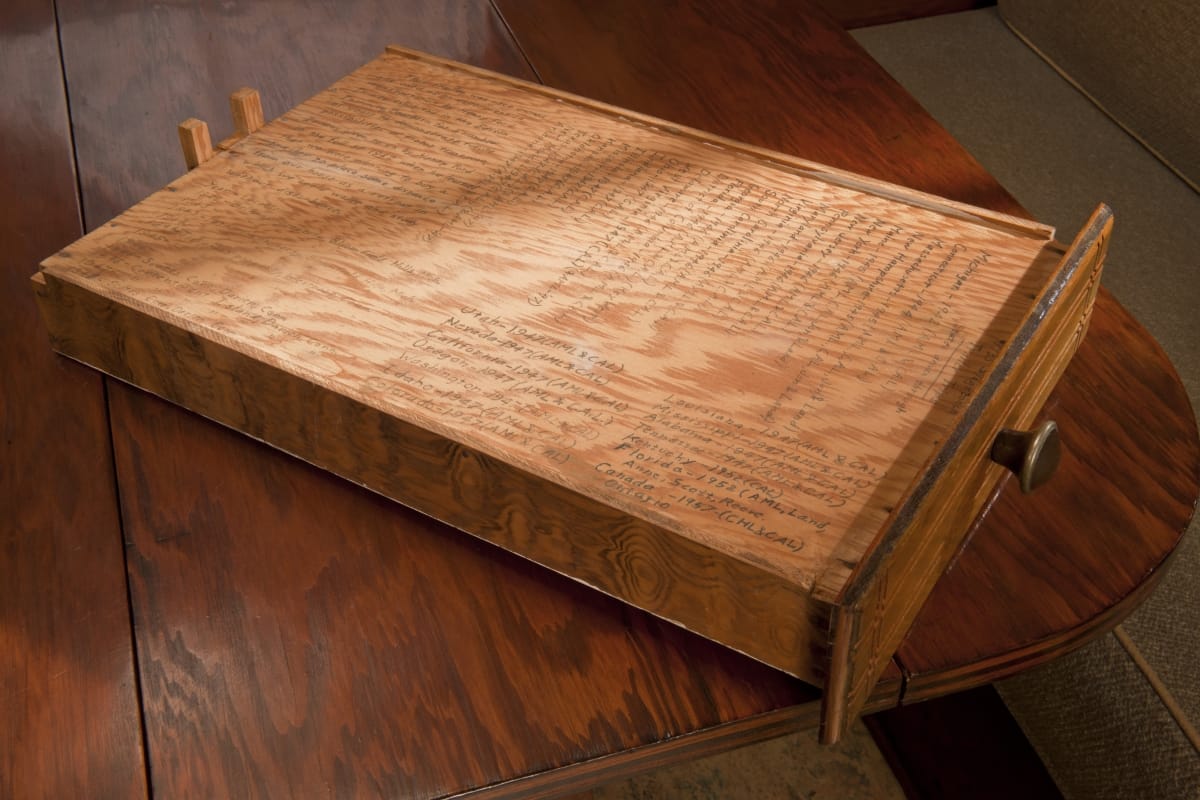 The following is handwritten on the bottom of a kitchen drawer in the trailer, by (most likely) Charles A. Lindbergh:
