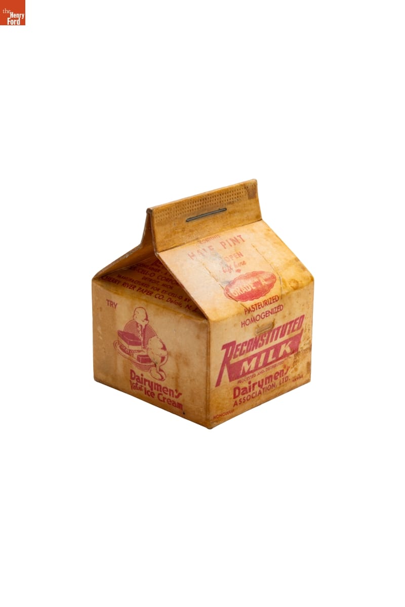 The quest for a shatter-proof milk container prompted John Van Wormer to patent a paper carton in 1915. Many processors and distributors continued to use breakable glass bottles, but, after 1937, mechanized production made the disposable, wax-coated folded cartons inexpensive and indispensable liquid containers. The iconic design, a box with a gable-end top with a pouring or drinking spout, remains the industry standard today.