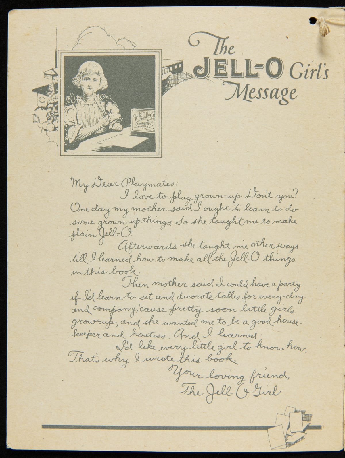 Jell-O introduced one of its most successful marketing strategies, the Jell-O Girl, in 1904. She helped reinforce the idea that children loved Jell-O and proved that it was easy to make -- so easy a child could do it. This recipe booklet includes the Jell-O Girl's favorite party recipes and describes tips every hostess should know.