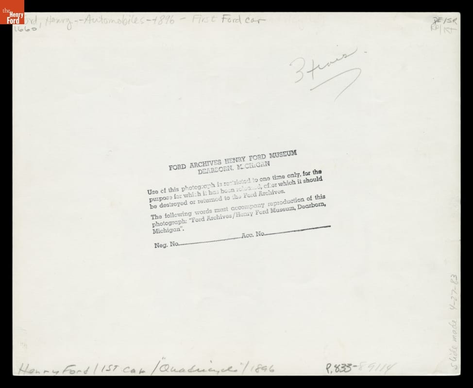 This photograph shows Henry Ford, age 33, with his first gasoline-powered vehicle in October of 1896. He built the Quadricycle with help from some friends in a shed behind a house he and his wife, Clara, rented.