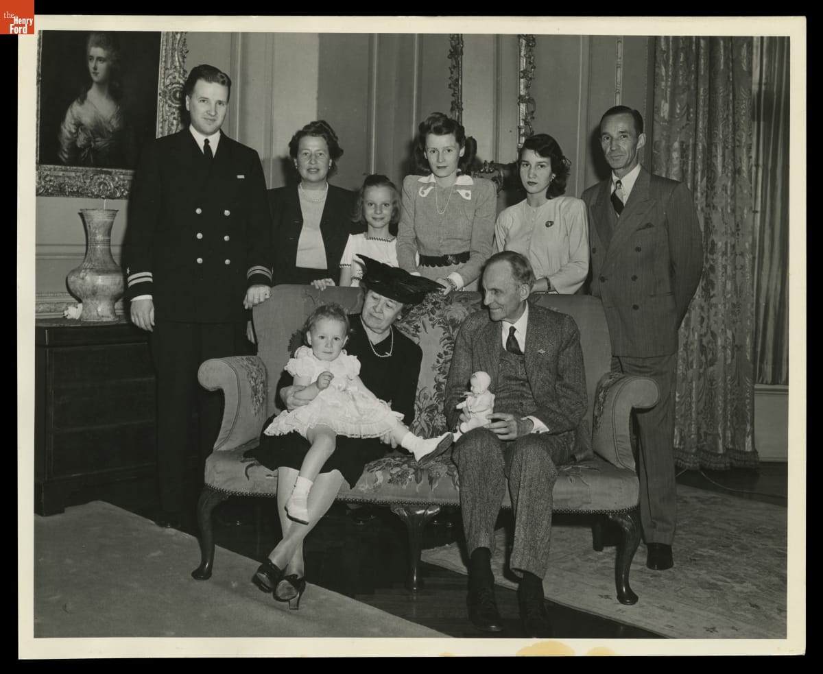 Members of the growing Ford family posed for this portrait at Edsel and Eleanor Ford's Grosse Pointe Shores, Michigan, home in 1943. Clara Ford and Henry Ford sit in front with their great-granddaughter, Charlotte Ford. Standing behind them are (left to right) Henry Ford II, Eleanor Clay Ford, an unidentified girl, Anne McDonnell Ford, Josephine Ford, and Edsel Ford.