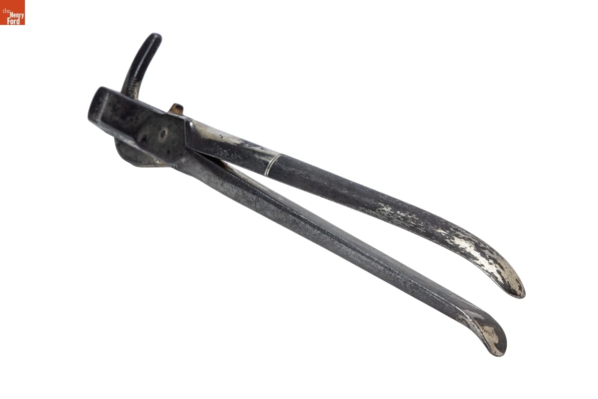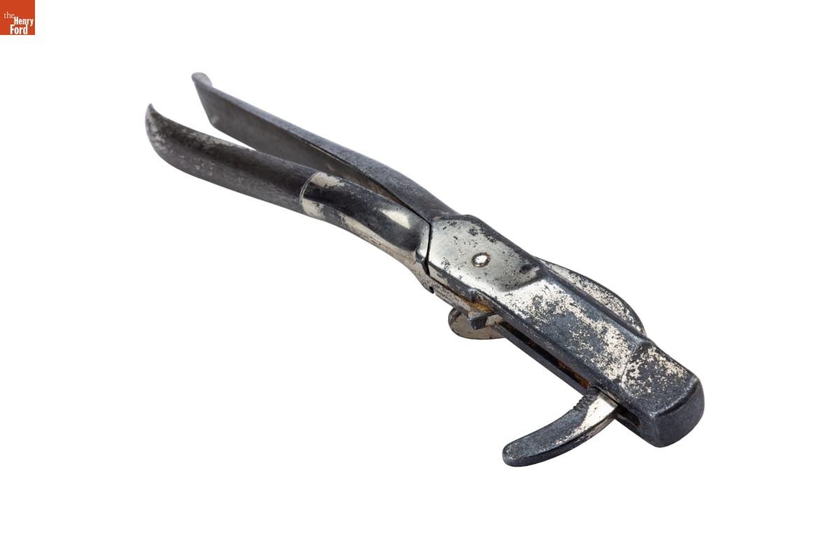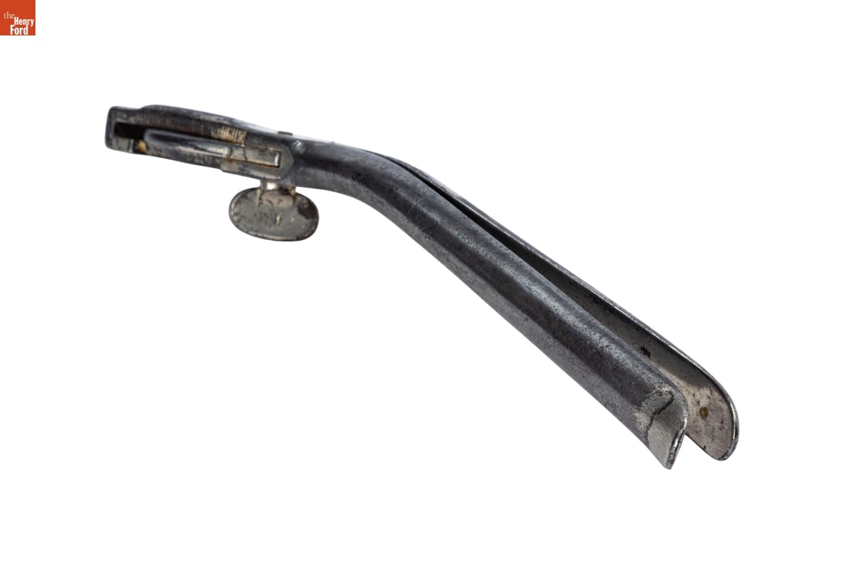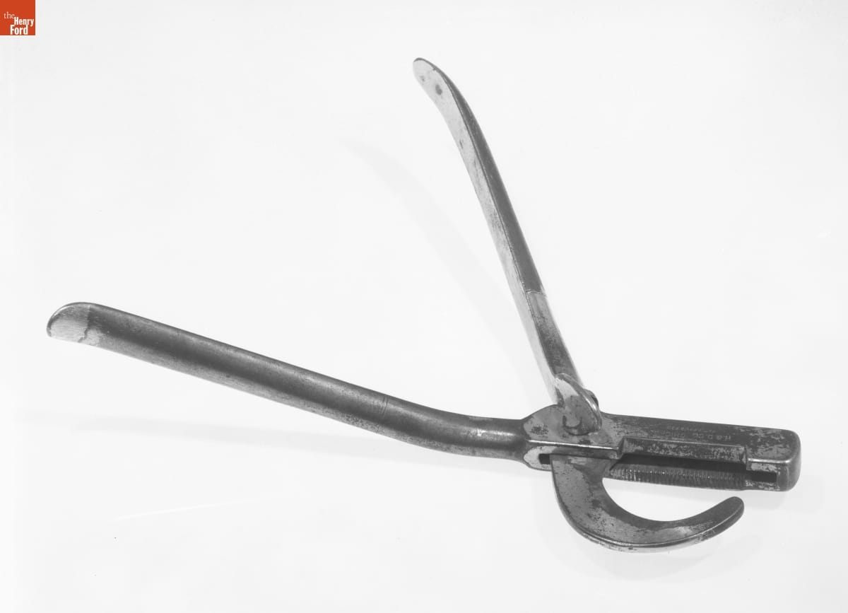 When farmers used horses for farm work, they worked with mares or geldings. A mare is a female horse, and a gelding is a castrated male. Castrating makes the animal more even-tempered, and easier to work. A veterinarian used this tool to crush the testicular cords on young stallions in order to geld them.