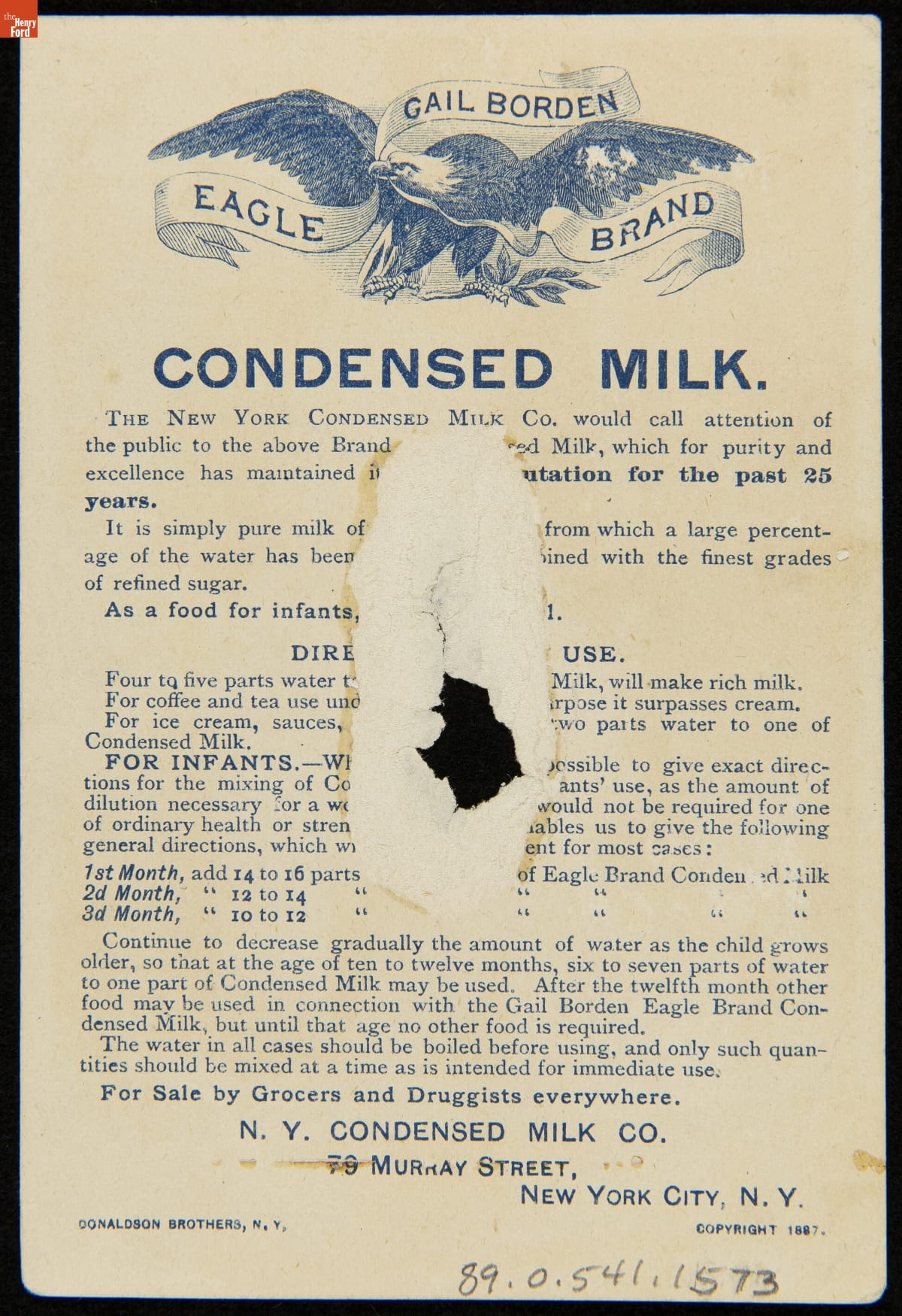 Feeding infants tainted cow's milk was a common cause of infant mortality. In 1856, Gail Borden introduced Eagle Brand Condensed Milk to combat this. This product became so popular for soldiers during the Civil War that, by the end of the war, it had gained a reputation for being safe, wholesome, and nourishing -- a trusted food for infants and children.