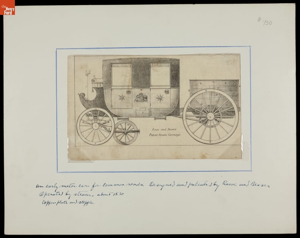description beneath: An early motor car for common roads. Designed and patented by Rawe and Bease. Operated by steam. Date: about 1830. Copperplate and stipple