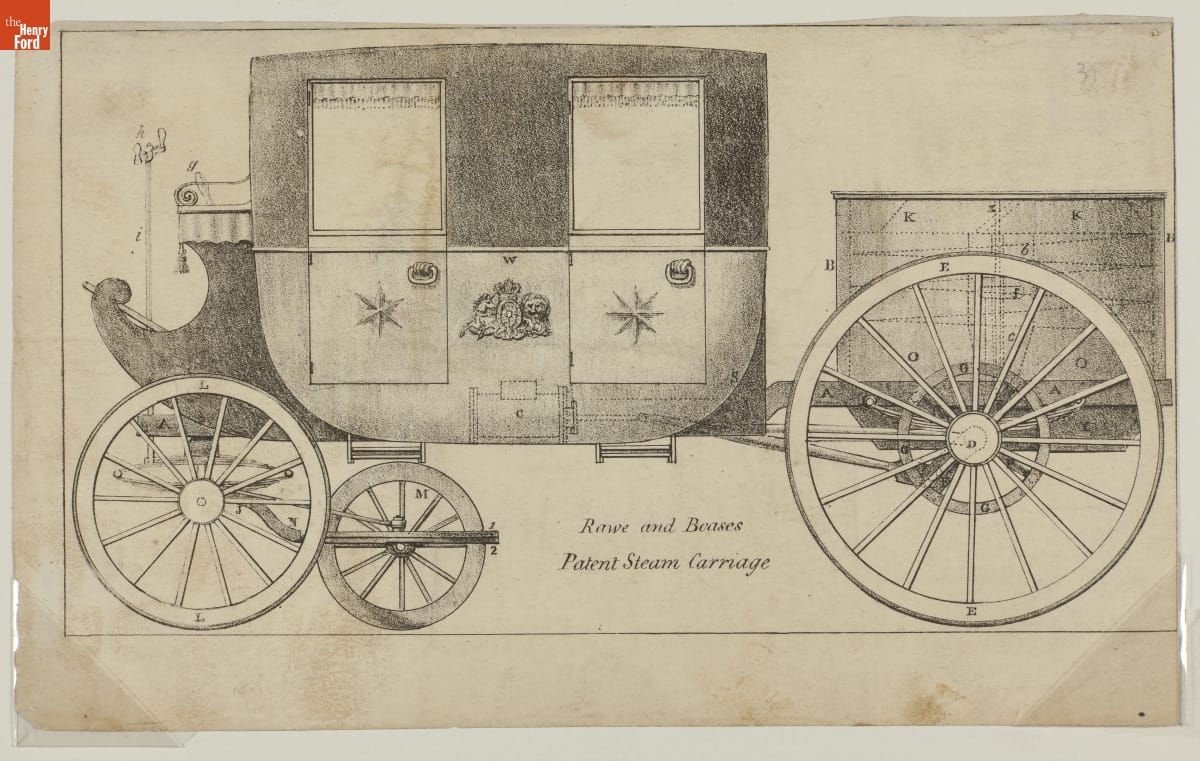 THF203898 / Copperplate Engraving, "Rawe and Beases Patent Steam Carriage," circa 1830 / detail