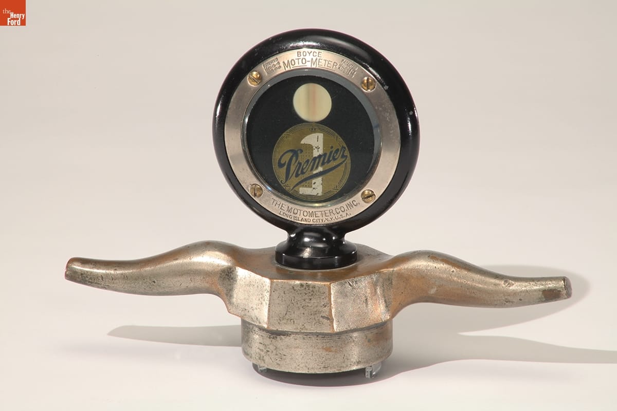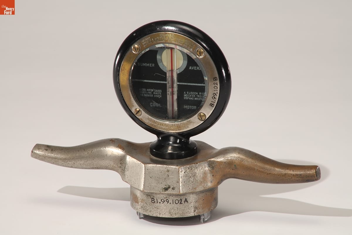 Automobiles often came without temperature gauges before the early 1930s, so enterprising manufacturers sold aftermarket motometers. Mounted on a car's radiator, these devices measured and displayed coolant water vapor temperature, notifying drivers if their automobiles were in danger of overheating. Moto-Meter Co. Inc. dominated the American market, producing the popular Boyce motometer and others featuring an automotive manufacturer's name or logo.