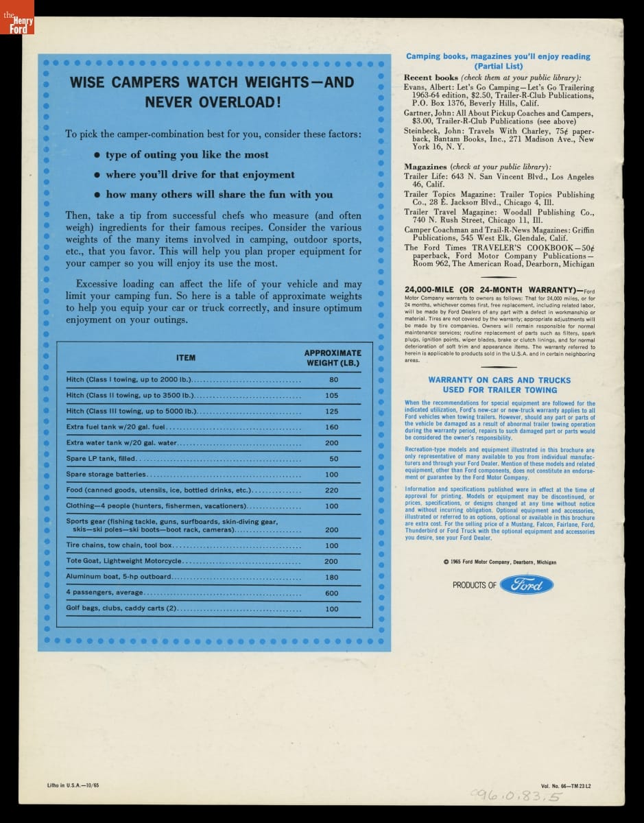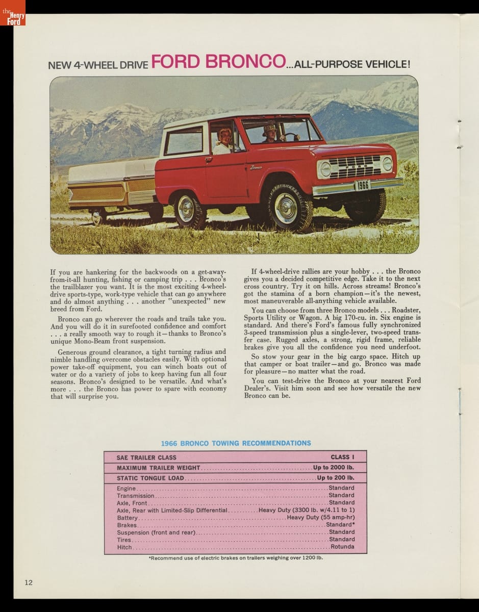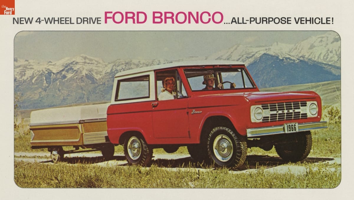 Ford tapped into the booming post-World War II recreational travel market with this sales brochure for 1966. Family station wagons, powerful cars for towing trailers, and Econoline vans and F-series trucks equipped for camping were all featured. The brochure also spotlighted the new Ford Bronco, a four-wheel-drive model that competed with the Jeep CJ-5 and the International Harvester Scout.