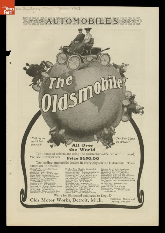 The Curved Dash Oldsmobile arguably was the world's first mass-produced automobile. By 1904, Olds Motor Works built 5,000 cars a year. At just $650, the little runabout was within the means of middle-class buyers. This 1903 advertisement promotes the Oldsmobile's wide use and availability. It also hints at the car's dependability: "Nothing to watch but the road."