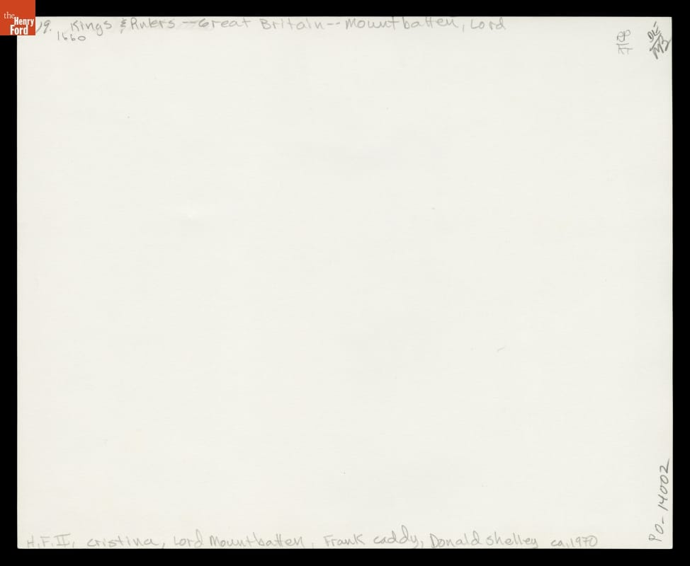 Lord Mountbatten was great-grandson of Queen Victoria, a British World War II hero and viceroy of India in 1947 during that country's partitioning and independence. In April 1972, he toured Henry Ford Museum and Greenfield Village, accompanied by Henry Ford II and Edison Institute's president, Donald Shelley. The group hit all the institute's highlights, including a dinner at Eagle Tavern.