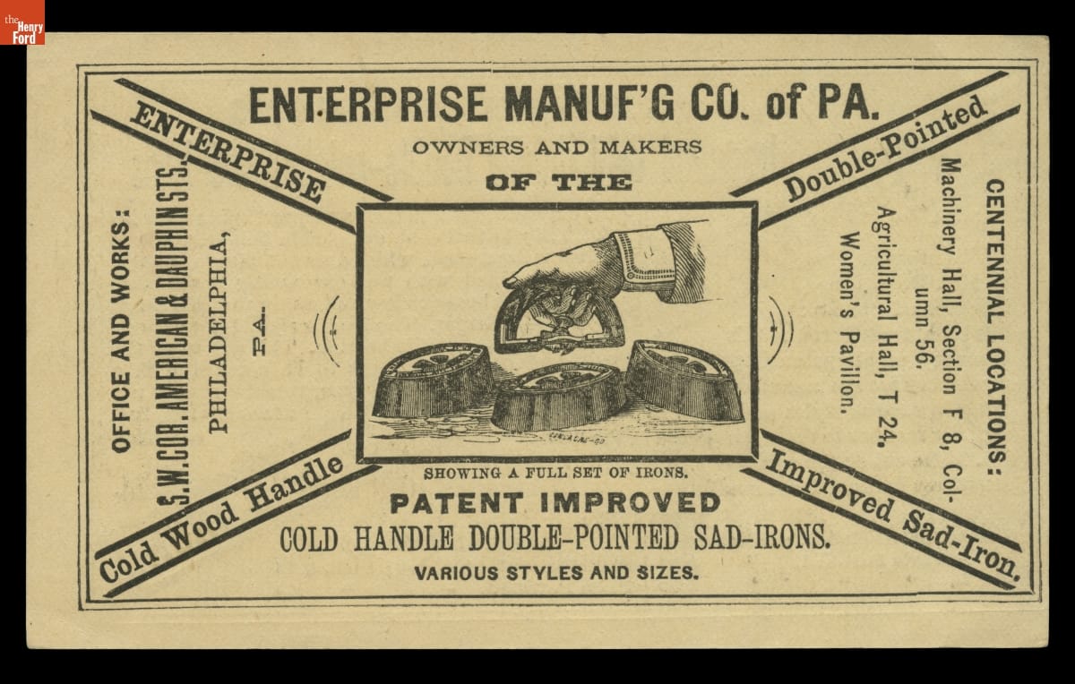 Trade Card for Mrs. Potts' Cold Handle Sad Iron, Enterprise Manufacturing Co., 1876-1880