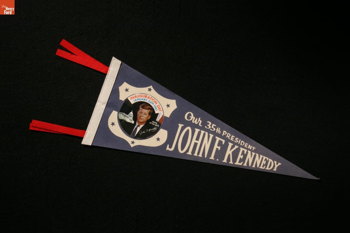 John F. Kennedy won the 1960 presidential election by a razor-thin margin, but after taking office he received the support of most Americans. Standing on the Capitol steps on the cold morning of January 20, 1961, with supporters proudly waving pennants like this, Kennedy was sworn in as President and delivered what has come to be considered a classic Inaugural Address.