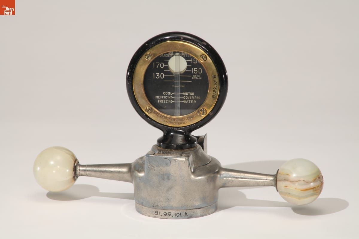Automobiles often came without temperature gauges before the early 1930s, so enterprising manufacturers sold aftermarket motometers. Mounted on a car's radiator, these devices measured and displayed coolant water vapor temperature, notifying drivers if their automobiles were in danger of overheating. Moto-Meter Co. Inc. dominated the American market, producing the popular Boyce motometer and others featuring an automotive manufacturer's name or logo.