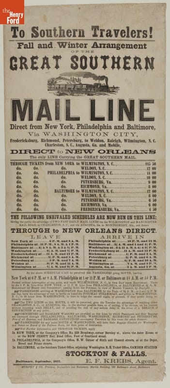 Printed by Murphy & Co. in Baltimore, Maryland, this broadside informed the public of the arrangements and schedules available for travel from New York City, Philadelphia, and Baltimore via the Great Southern Mail Line in 1857. The broadside includes the times and lengths of rail trips to such southern cities as Richmond, Virginia; Wilmington, North Carolina; and Mobile, Alabama.