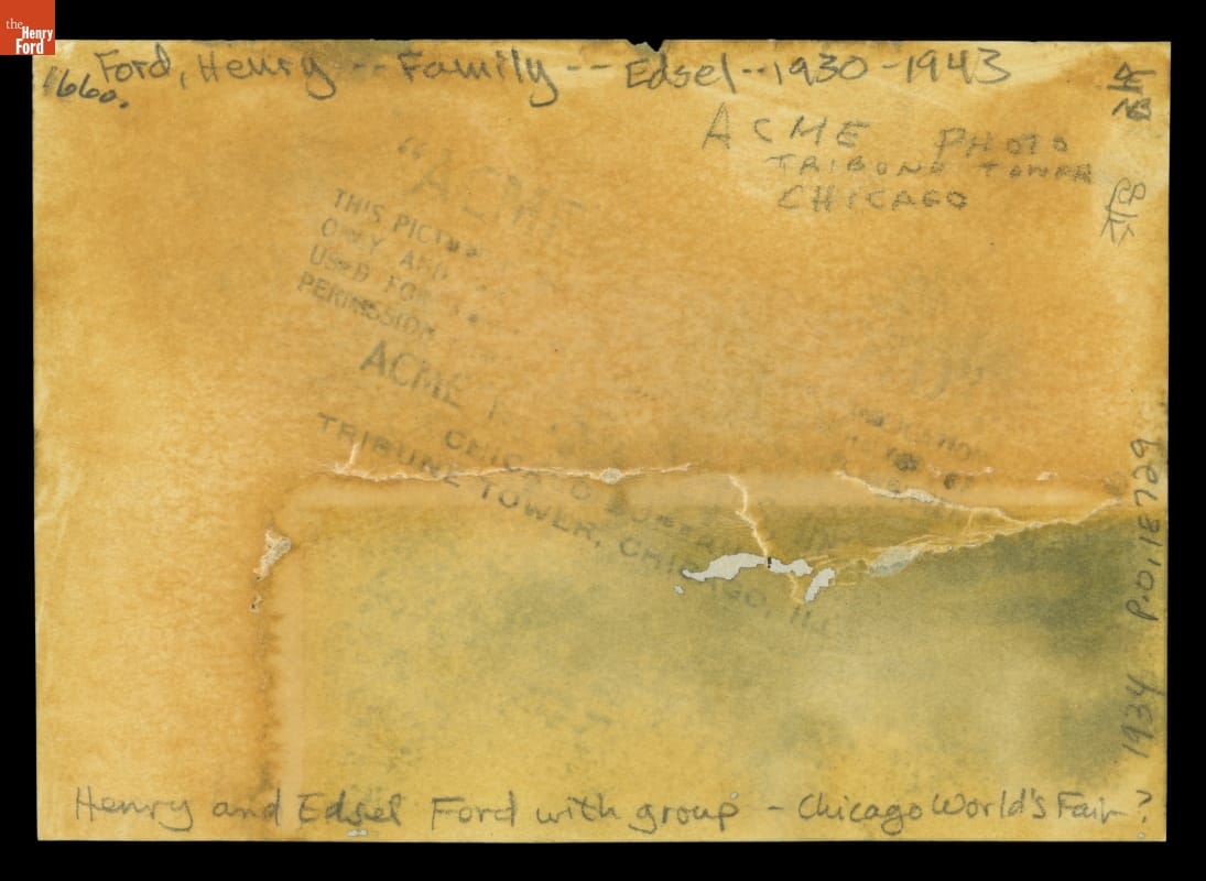 Henry Ford and Edsel Ford at Century of Progress Exposition, Chicago, Illinois, 1934