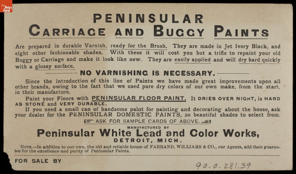 Trade Card for Carriage & Buggy Paints, Peninsular White Lead & Color Works, 1880-1900