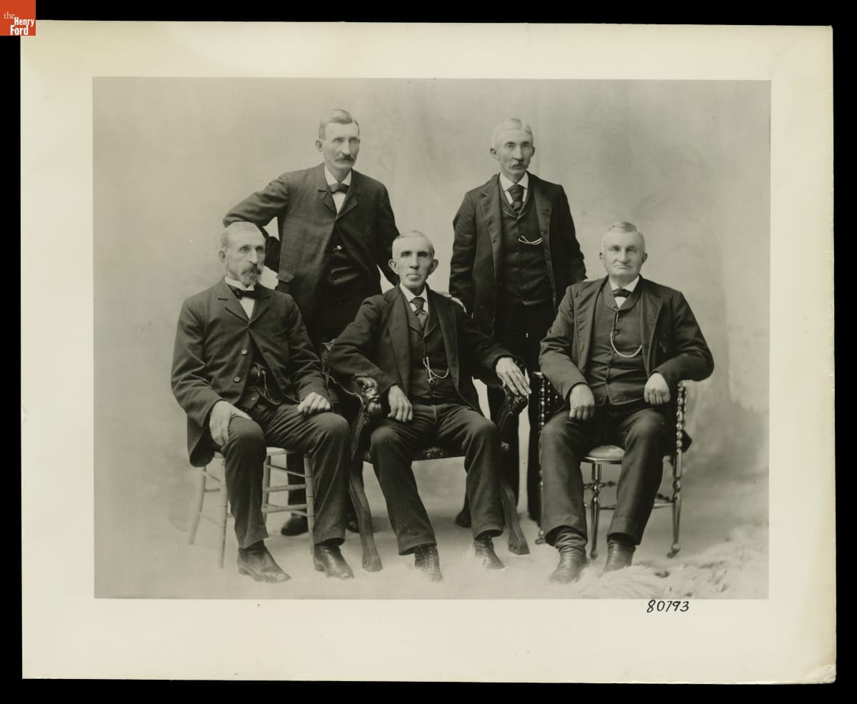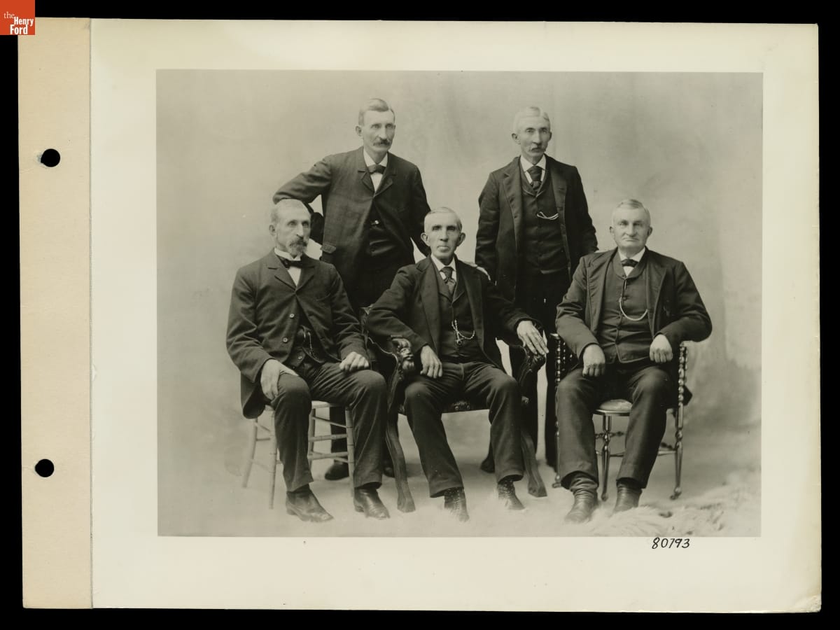 Samuel and Ann "Nancy" Ford emigrated from County Cork, Ireland, to Dearborn, Michigan, in 1832. Five of their sons posed for this portrait taken about 1880. Standing, left to right: Samuel and James. Sitting, left to right: George, William, and Henry. These men were cousins to William Ford, father of automotive industrialist Henry Ford.