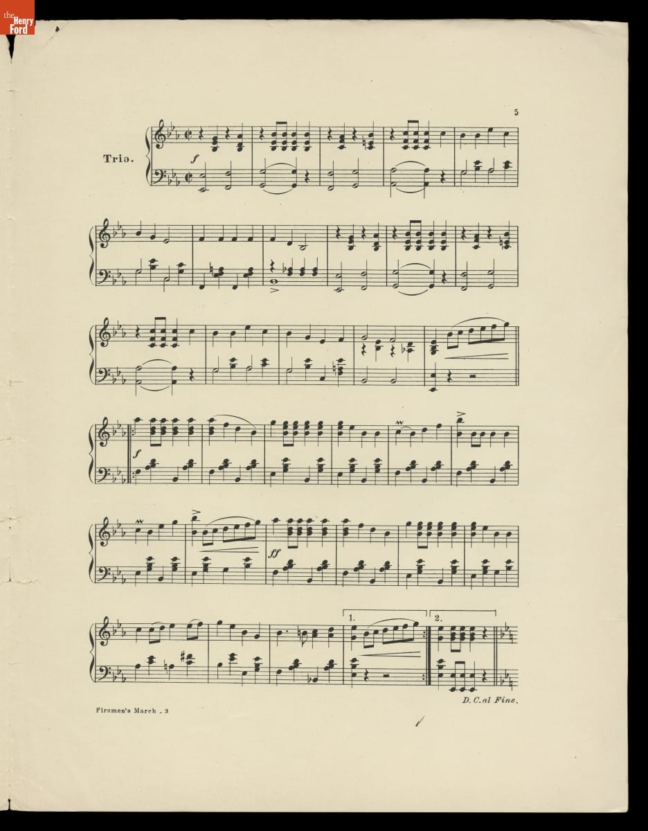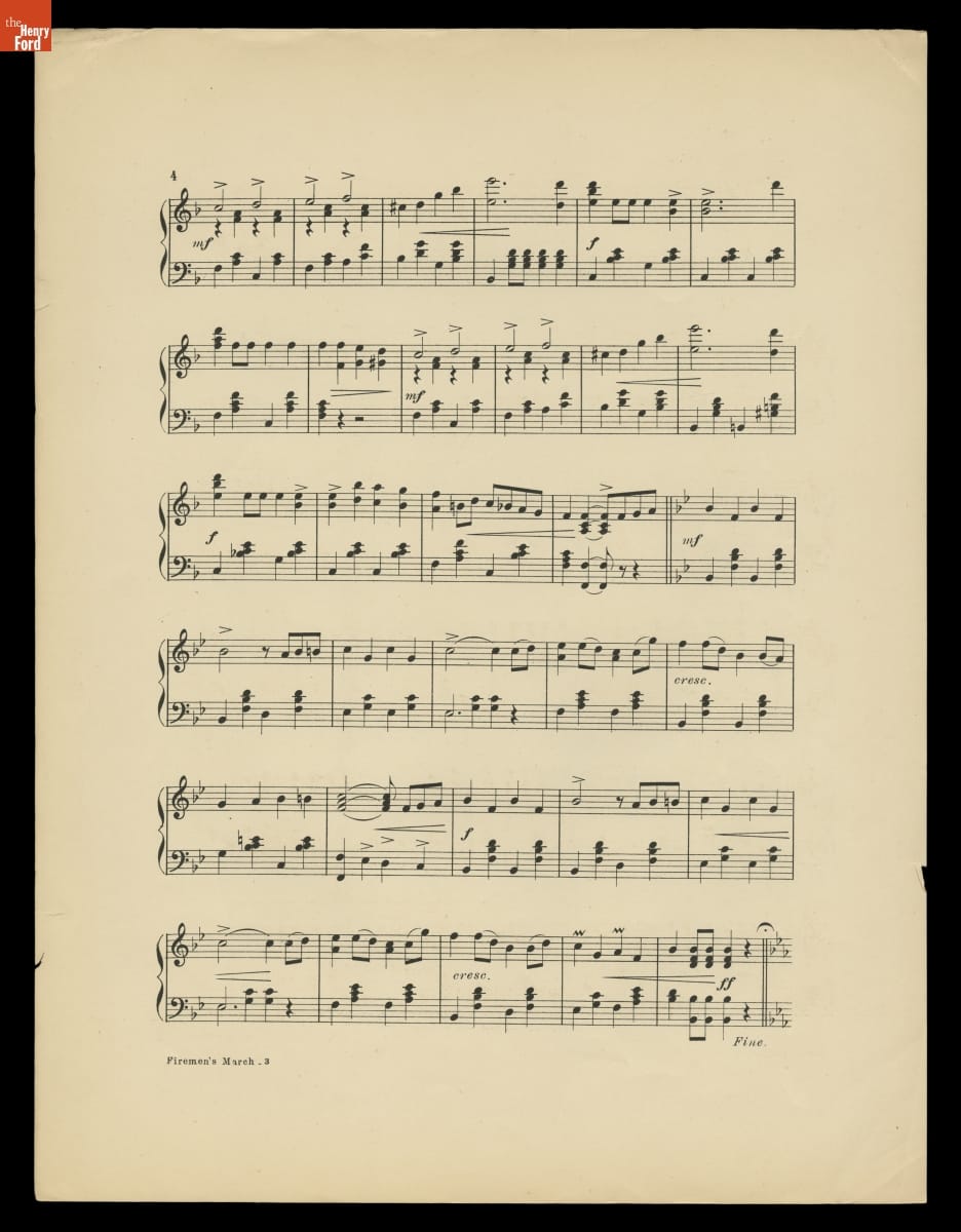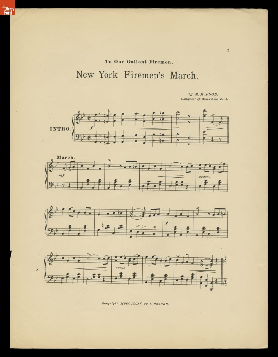 The firefighter became -- and remains -- a heroic symbol of bravery and devotion to duty. Firefighters were celebrated in books, on stage, and in song. The "New York Fireman's March" was written by Mark M. Doob in 1894. Hugh Bonner, the sixth New York City Fire Commissioner, is pictured on the cover of the sheet music.