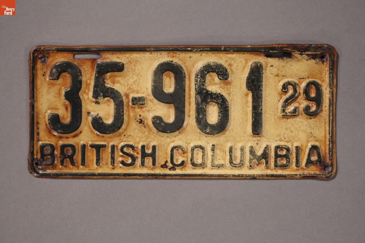Early license plates issued by Canadian provincial governments consisted of porcelain coated steel, embossed or painted tin, or fiberboard. By the 1920s most provinces produced plates made of embossed steel. Automobiles registered in British Columbia in 1929 sported a plate like this one.