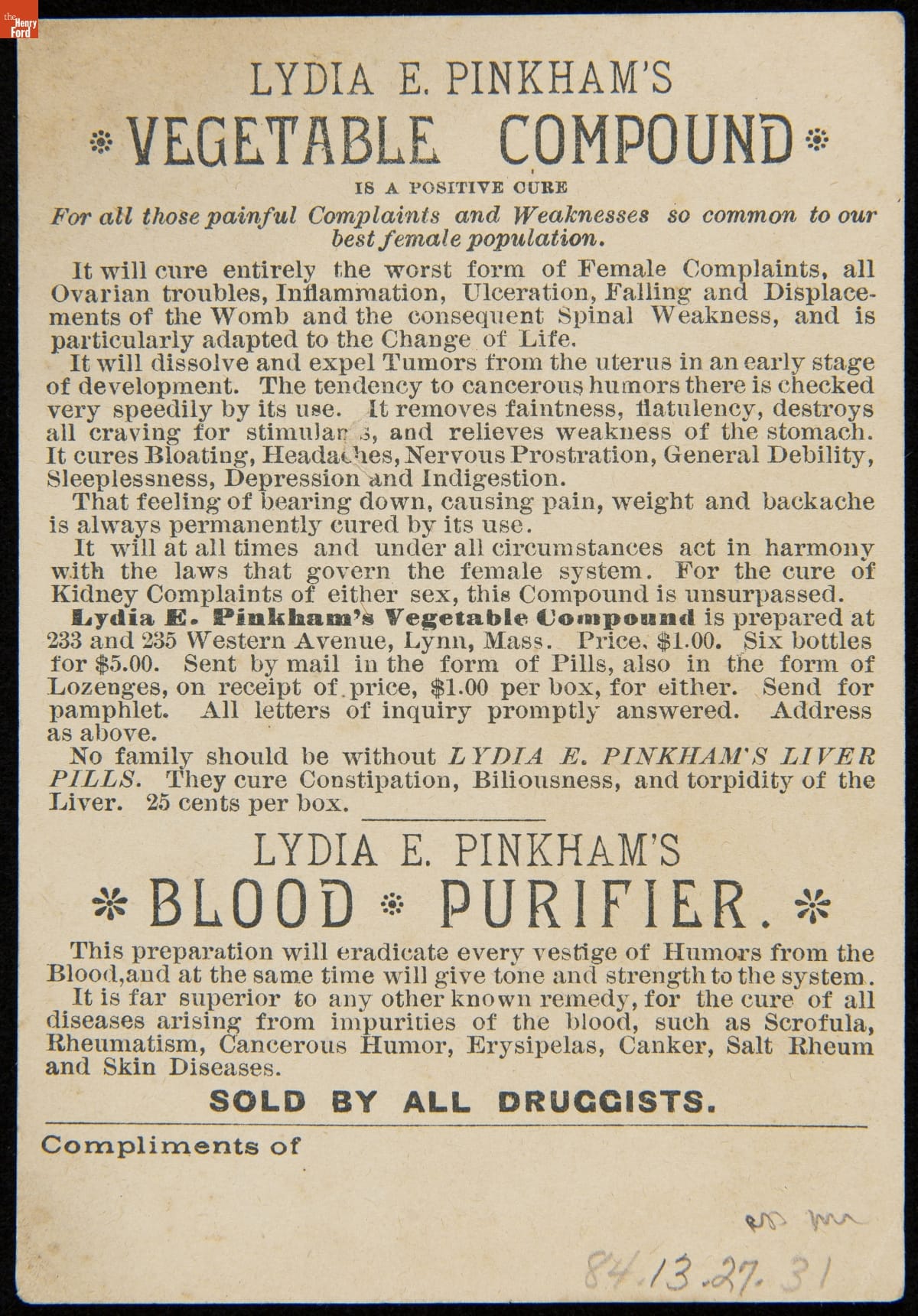 In 1873, Lydia E. Pinkham created "Pinkham's Vegetable Compound," a mixture of roots, herbs, and alcohol that she claimed would treat a variety of "female complaints." A few years later, Pinkham established a patent medicine company and began marketing and selling her product. Pinkham publicized the herbal remedy through pamphlets, magazine and newspaper advertisements, and small trade cards like this one.