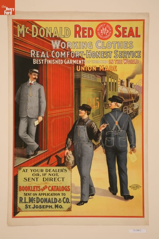 Poster reads: MC DONALD RED SEAL/ Working Clothes/ Real Comfort - Honest Service/ Best Finished Garments of their kind In The World/ Union Made/ At Your Dealer's/ or, if not/ Sent Direct/ Booklets and Catalogs/ Sent on Application to/ R.L. McDonald & Co. St. Joseph, Mo./
