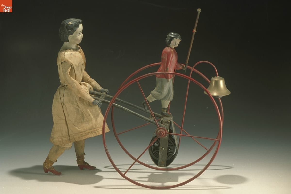 Toy makers have long experimented with ways that toys could simulate human and other real-life action. Different mechanisms could motivate dolls, engines, cars, boats, and other novelty toys. The mechanism on the two-wheeled vehicle powers the walking doll and turns the wheels around, causing the figure of the boy to rock slightly and the bell to ring.