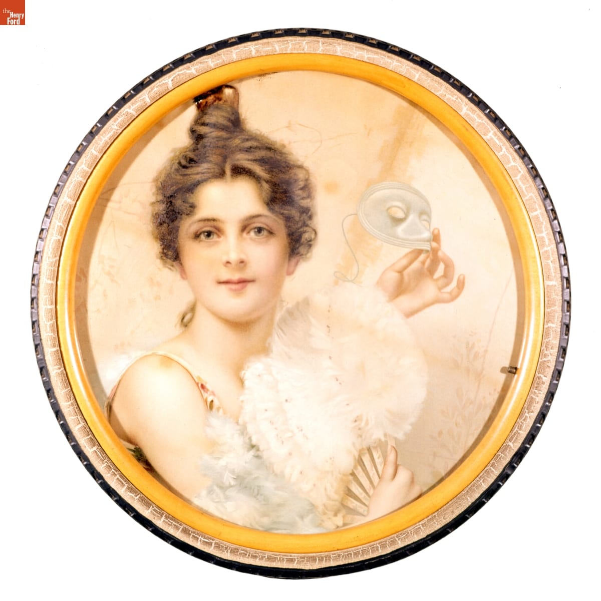 Woman Holding a Mask and Fan in a Rubber Tire Frame, circa 1897