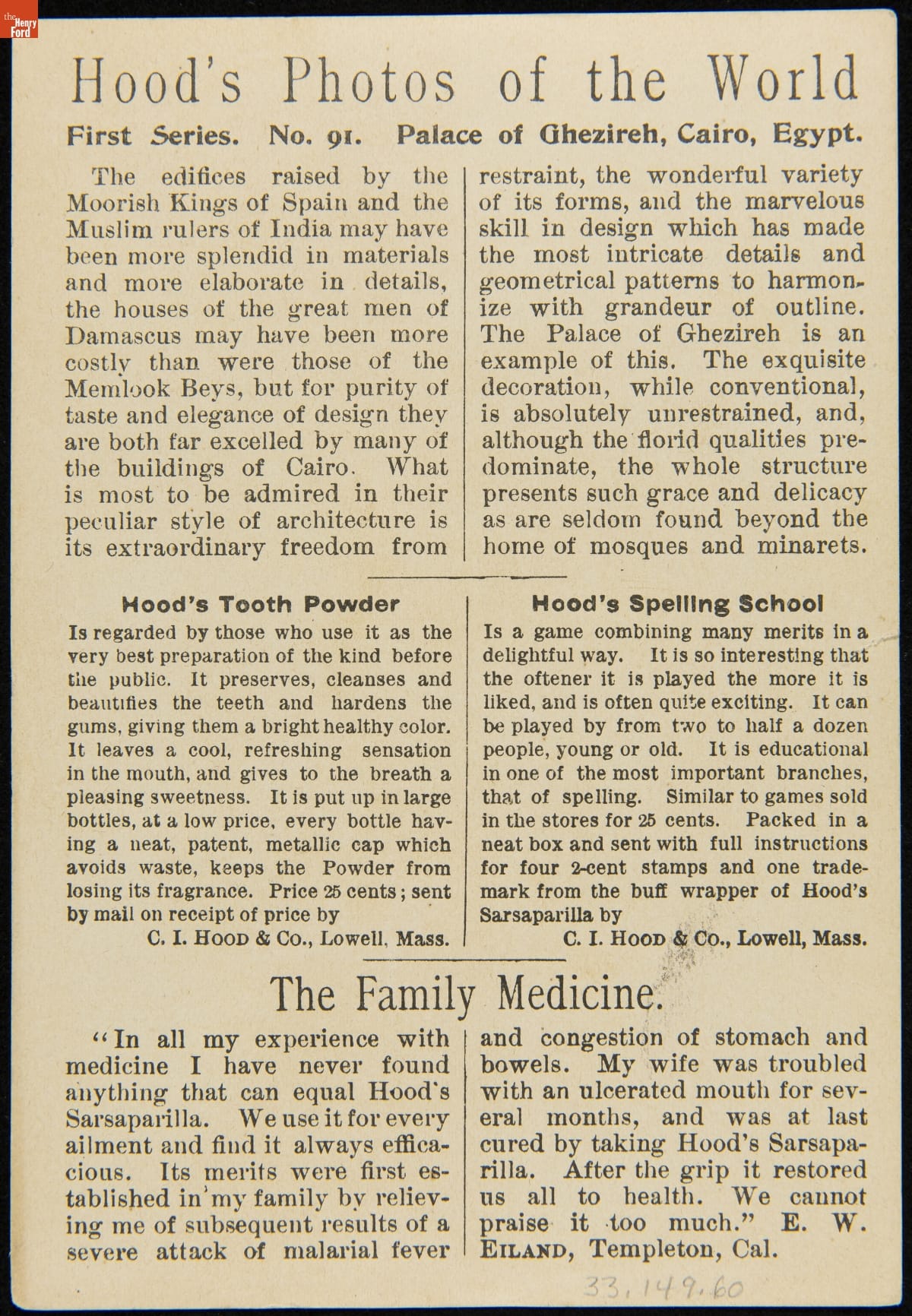 In the late 19th century, trade cards were a major means of advertising goods and services. Patent medicine producer, C.I. Hood & Co., had its own advertising department, creating cookbooks, calendars, and, most abundantly, trade cards. The trade card series, "Hood's Photos of the World," became popular among consumers, as it offered views of far-away places, providing a window to the broader world.