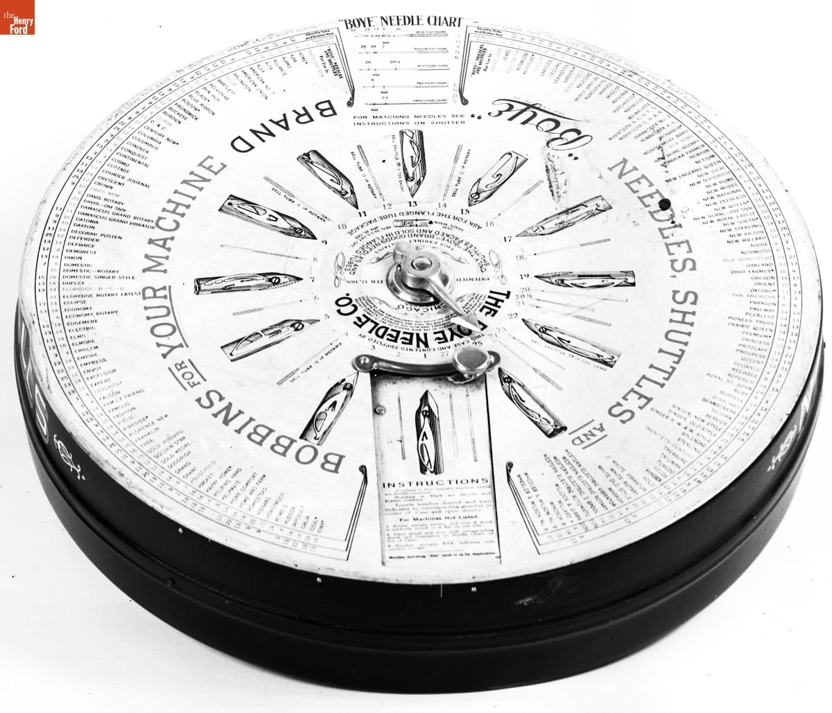Manufacturers frequently made display materials available to retailers to help encourage increased sales of the company's product. This Boye Needle Company product display not only displayed sewing machine needles, shuttles and bobbins in an attractive dispenser, but also included a chart to help determine the appropriate size accessory needed for different makes of sewing machines.