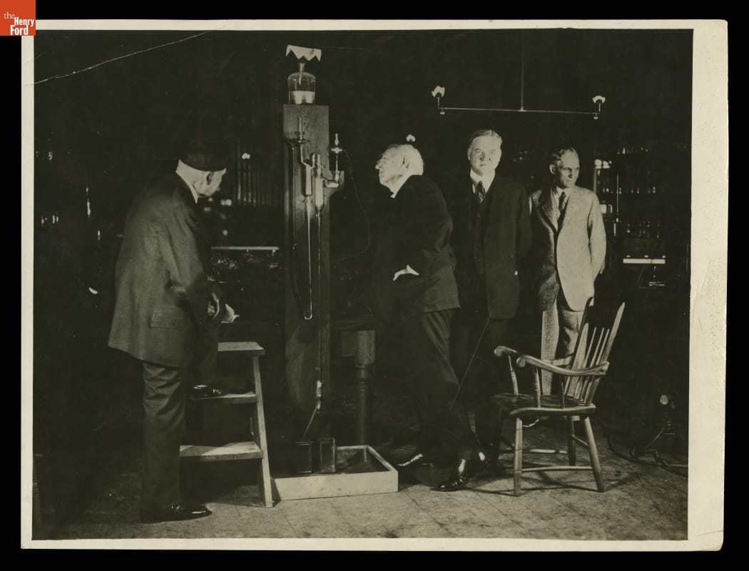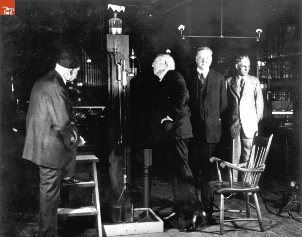 Francis Jehl, Thomas Edison, President Herbert Hoover, and Henry Ford at Menlo Park Laboratory in Greenfield Village, 1929