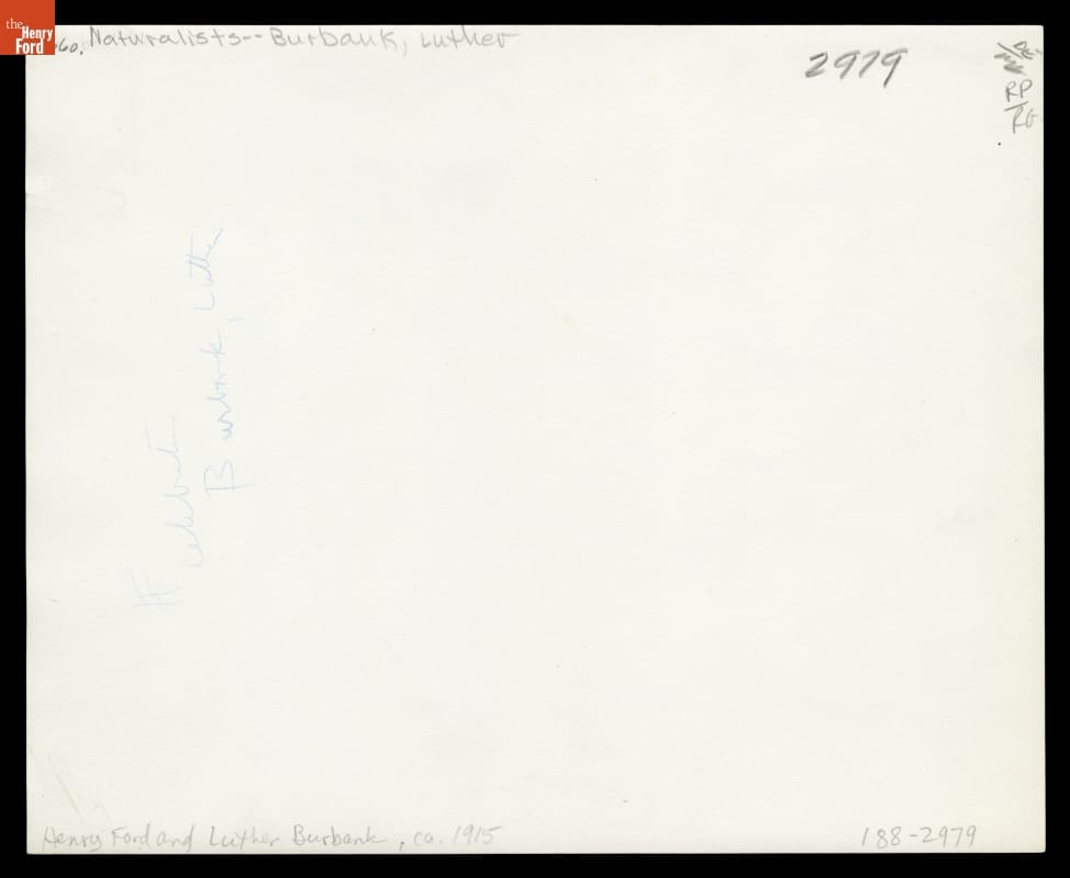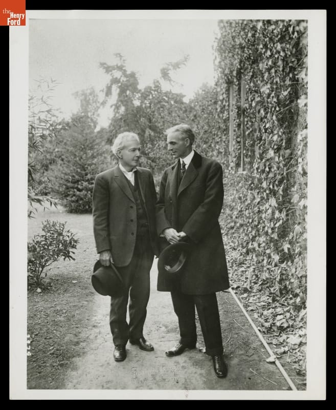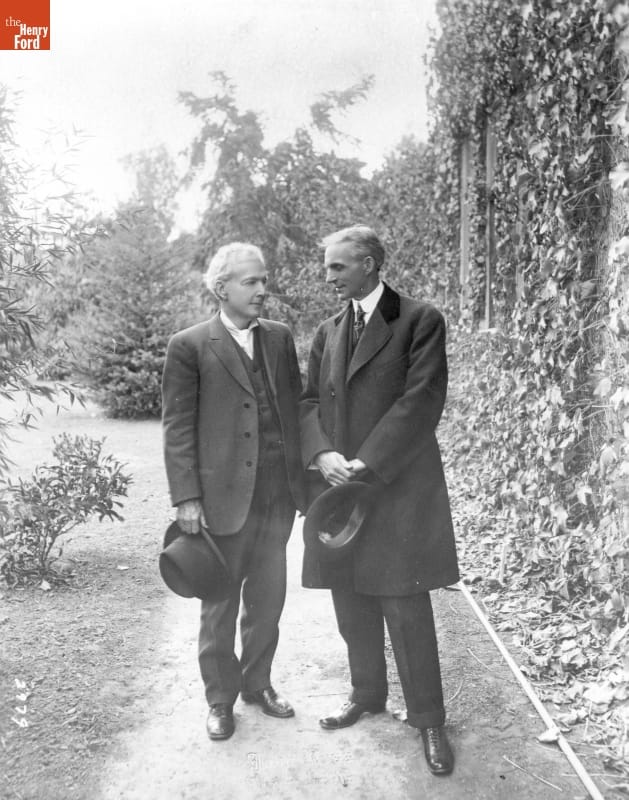 Henry Ford admired the work of Luther Burbank (1849-1926), an American plant breeder, naturalist, and author who was especially noted for his experiments with plants, fruits, and vegetables. The fellow innovators posed together for this photograph around 1915.