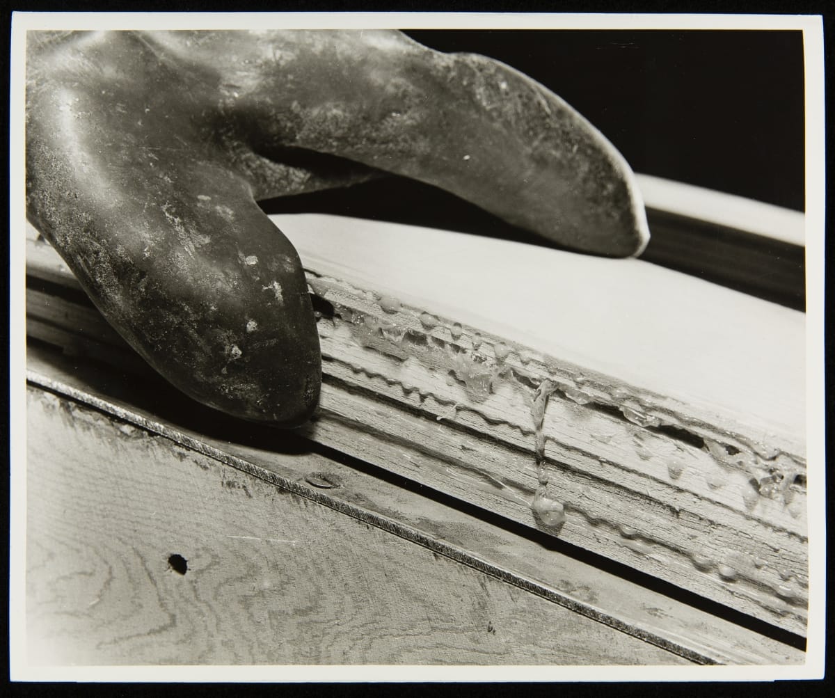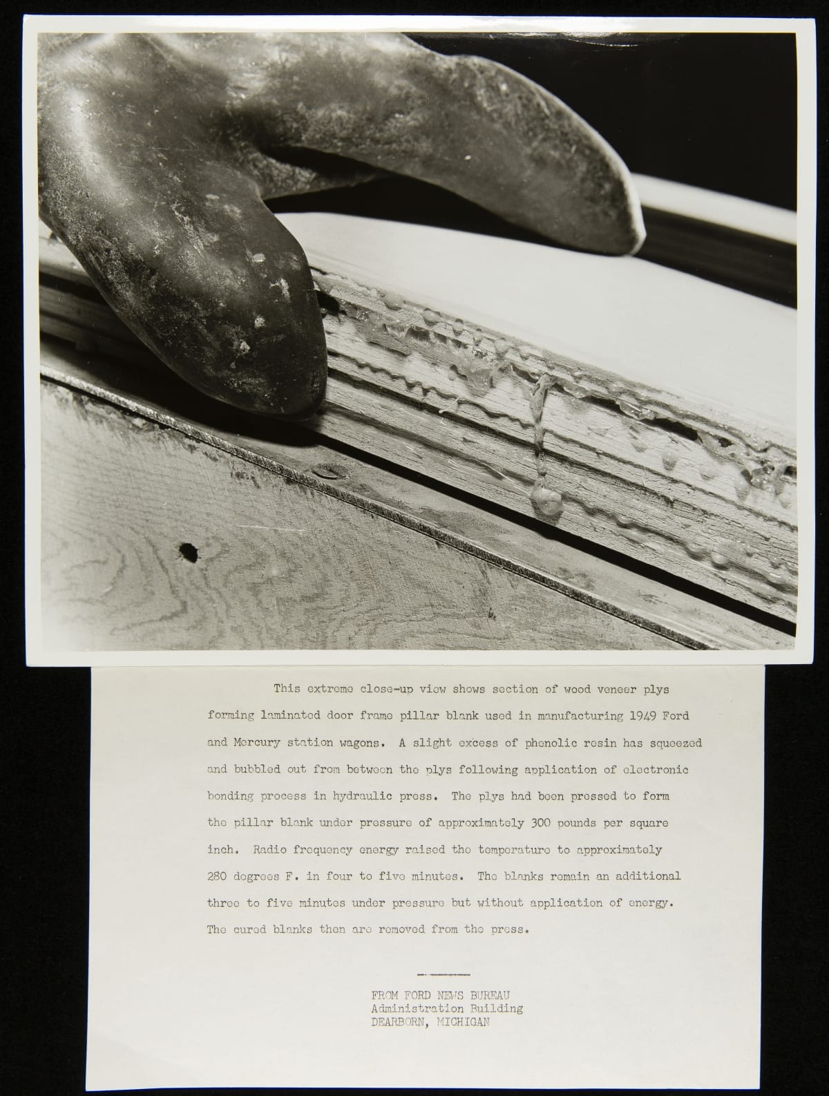 Close-up of Adhesive on Wood Veneer Door Frame Pillar for Ford Station Wagons, Iron Mountain Plant, March 1949