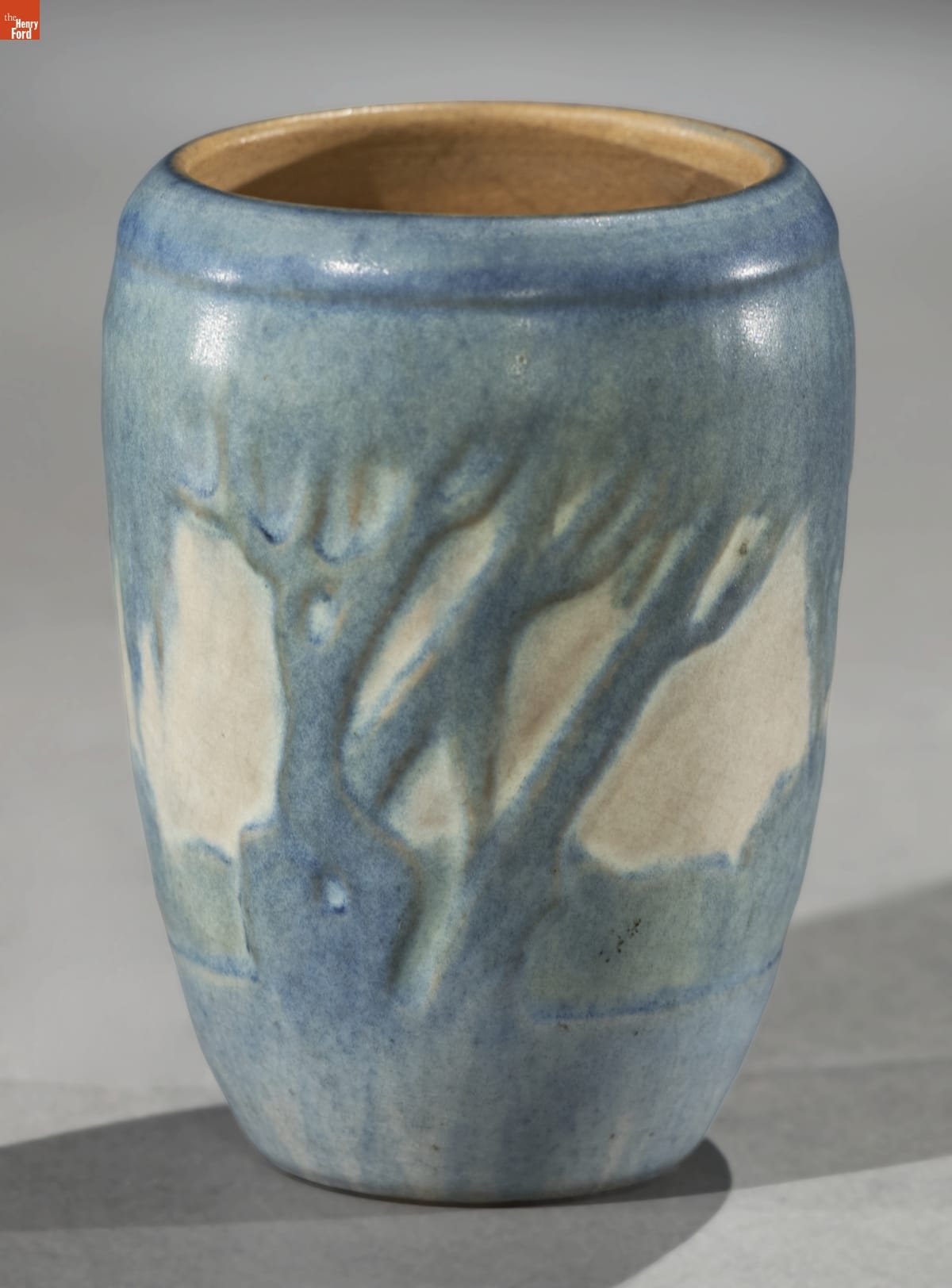 The imagery of live oaks with moss is typical of the production of the Newcomb College Pottery. The Newcomb College Pottery, based in New Orleans, trained young women in the art of painting decorative pottery as a pastime. The pots were made by men and supplied to the female students. Each student could decorate and sell their pieces, as long as they gained faculty approval.