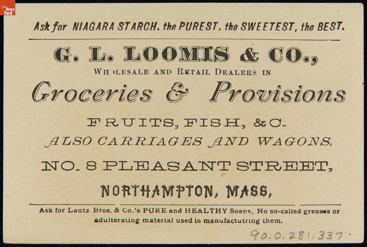 In the last third of the nineteenth century, an unprecedented variety of consumer goods and services flooded the American market. Advertisers, armed with new methods of color printing, bombarded potential customers with trade cards. Americans enjoyed and often saved the vibrant little advertisements found in product packages or distributed by local merchants. Many survive as historical records of commercialism in the United States.