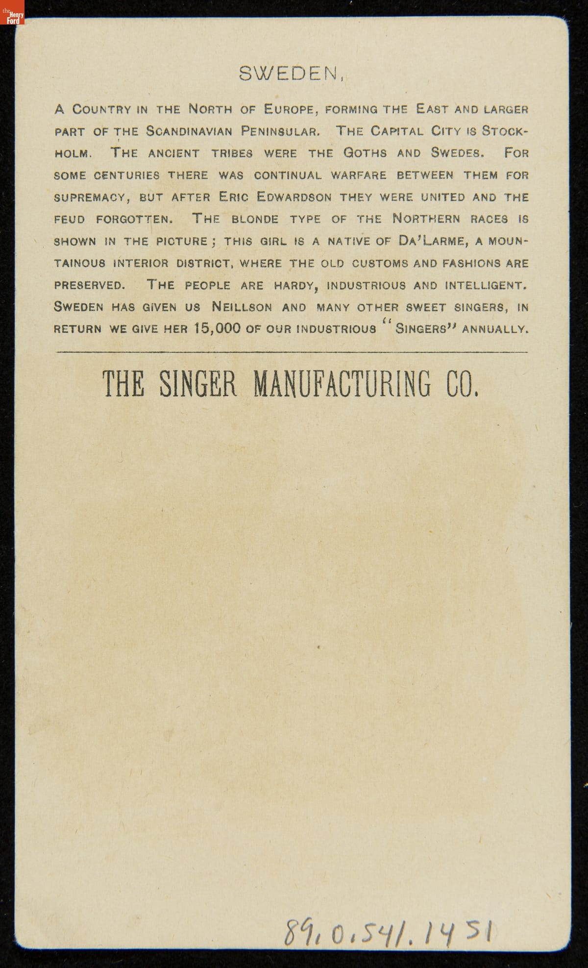 As color printing gained momentum in the late 19th century, trade cards became a major means of advertising goods and services. Americans enjoyed and often saved the vibrant little advertisements found in product packages or distributed by local merchants. The Singer Sewing Machine Company had a series of trade cards, like this one, offering images of Singer machine users from around the world in their national dress.