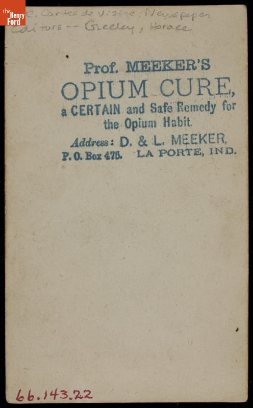 Cartes-de-visite, small, professionally made photographs on cardboard stock, remained popular in the United States from the Civil War in the 1860s through the 1880s. Many were given to friends and loved ones, but enterprising photographers also produced images of famous individuals to sell to the collecting-crazed public. Politicians, military officers, celebrities and other notable persons, such as abolitionist and editor Horace Greeley, were popular subjects.