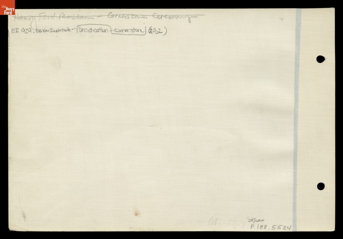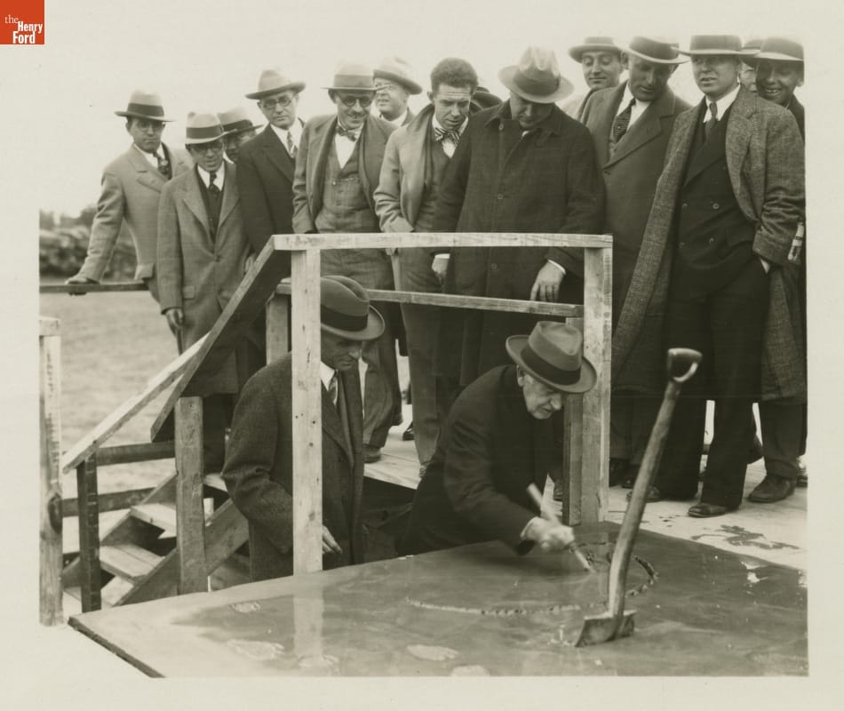 September 27th, 1928, on the future site of Henry Ford's new museum, famed inventor Thomas Edison placed a spade once used by legendary horticulturist Luther Burbank into a block of freshly poured Portland cement. Ford looked on as his friend and personal hero wrote his name in the wet cement, officially dedicating Henry Ford Museum--where this "cornerstone" is now displayed.
